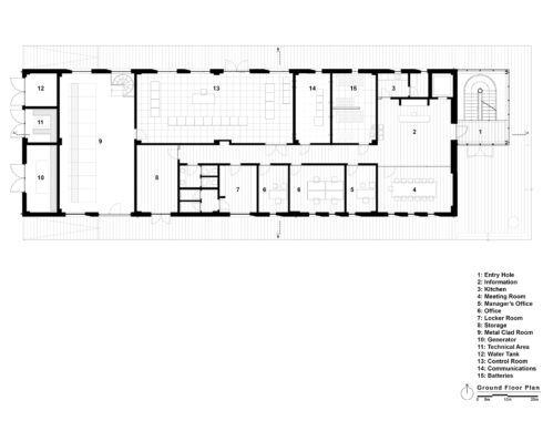 Acibadem Eskisehir Solar Power Plant Transformer Center, designed to serve as a control building for the solar energy field built to meet a large part of the energy needs of Acibadem Hospitals in Odunpazari, Eskisehir, includes a gathering area and viewing deck in addition to technical areas, and explores the relationship between masses that create contrast with each other. The ground-level mass achieves an opaque facade appearance through the use of straw plaster, while the upper mass forms an abstract volume using a silicone-composite glass facade to showcase the panoramic view. The straw plaster used on the facade also influences the interior space through various wall surfaces and furniture.
