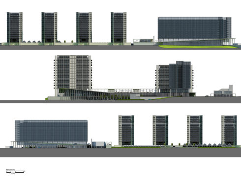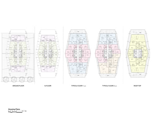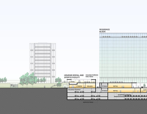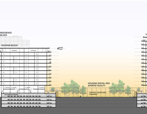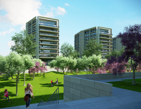 Forming different spaces within the same place… This was the main problem to be solved while working on the competition. Indeed, this problem had a set of architectural and urban solutions, and not a unique one. However, among them, one was more obvious and crucial for us: the circulation. Because of its specific position between the highway, metro and metrobus stations (elements belonging to the urban infrastructure) and the surrounding residential, commercial and industrial neighborhood, the project area was a potential and “fertile” passageway for pedestrians and cars, connecting macro and micro-scales, businesses and residences (if we consider the commuters), merging different speeds (highway and street), different lives. Besides these extrinsic parameters, there were also some intrinsic ones, resulting from the commission itself. Housing, residence and commerce were the major elements of the mixed-use program. Considering various user groups and the needs of these three distinctive functions, it is possible to say that the project area was at the intersection between different groups of people, requiring different spatial qualities. A stable and functional base, organized in such a way to create two main courtyards with different privacy levels, was crowned by housing and residence blocks and a shopping volume with contemporary forms. These were shaped in such a way to maximize the views and avoid face-to-face looks for the houses, to look light and transparent for the residences (which can also be rented as offices) and to become welcoming for the shopping zone.