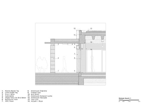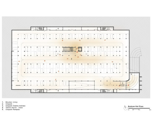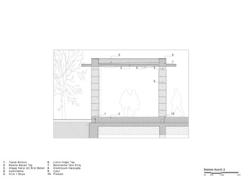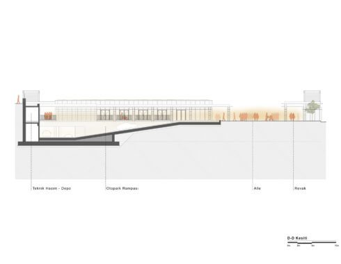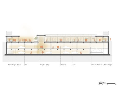 Ahmet Taner Kislali Square project consists of a series of indoor and outdoor spaces with different functions and scales, which were obtained by maintaining the traces of the city in accordance with the existing space-filling relations. It is possible to list these as follows: Alle, colonnade, square, park, courtyard and underground parking. These elements, which are subtly related to each other, facilitate access by eliminating the discontinuity in the city, and enrich the use of the area with their functions.