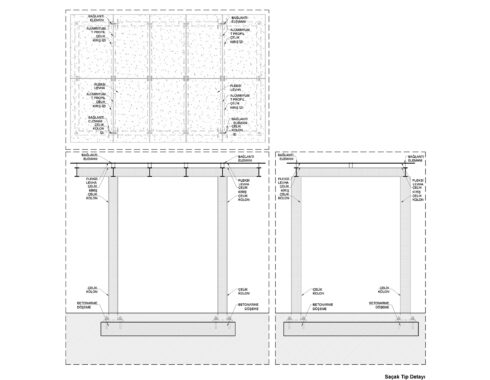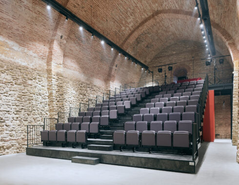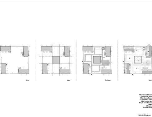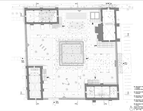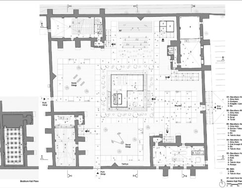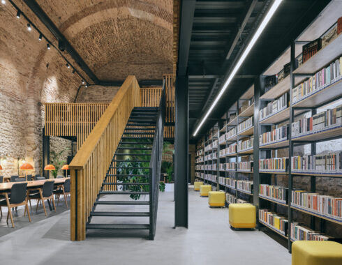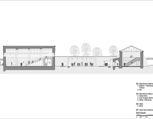 Building number 1, located in the southeast corner of the campus, was used as a library. The ground floor of the building was designated as a common working space, and a mezzanine floor consisting of two study spaces connected by a bridge was added. Building number 2 in the southwest corner was desihgnated as an exhibition area. Unlike other buildings, this building has a unique wooden floor. The floor in question has been preserved, and a walking route has been created underneath it, circling around the supporting piers. Building number 3 in the northwest corner was used as a blackbox. Thanks to the telescopic tribunes, it will be possible to use it as an amphitheatre, whenever desired. Finally, the building in the northeast corner was used as a multi-purpose hall. The door operating from Rauf Orbay Street was preserved even though it wasn’t original, and the upper and lower levels are connected to each other via a newly added staircase. In building number 4, unlike the other three buildings, the brick vault covering the volume has not survived to the present day and has been replaced by an iron roof structure. Instead of building a new vault into the building, it was suggested to renew this structure.