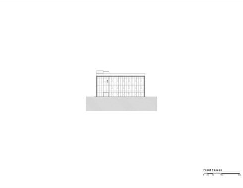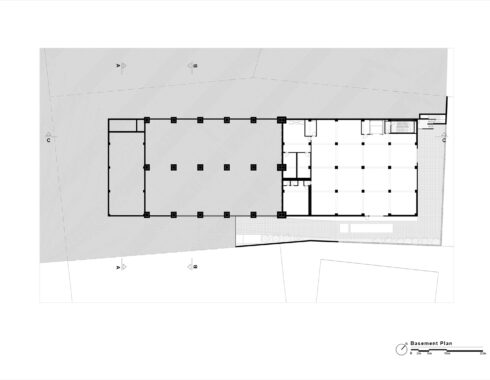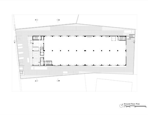 The building is composed of two parts: The office section looking towards the road and the production and storage areas at the back. The former one consists of three storeys, connected with a circulation tower at one end. The ground floor is reserved for the entrance hall, the information desk, a meeting room, the refectory and dressing rooms. The first floor contains the common office areas and the second floor is reserved for the administration. Contrary to the office part, the production and storage section contains a basement floor, making use of the site’s slope. The ground floor which contains the main production, is double storey high, allowing the first floor to be on the same level with the office section’s second floor.