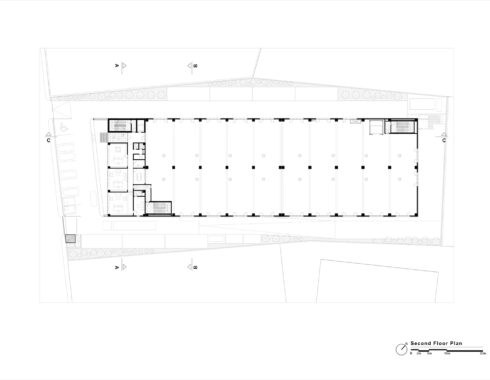 The office section is a conventional reinforced concrete structure, whereas the production and storage zone is made out of prefabricated reinforced concrete elements. Distinction between the two sections is further emphasized with the help of the materials used on their facades. The office section is clad with aluminum composite panels on the sides, which continue on the main canopy at the top. Besides protecting the building against the western sun and the rain, this canopy helps to regulate the difference between the angles of the road and the front facade. The curtain window system on the front facade both gives the building a transparent appearance and reflects the industrial environment.