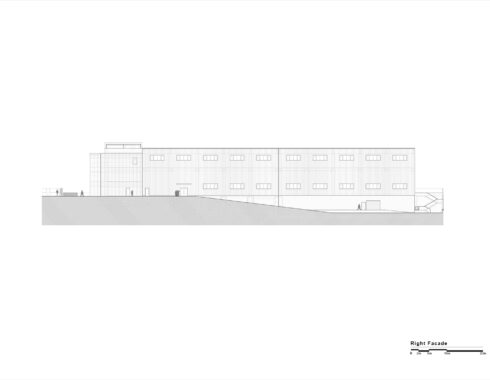 The production and storage areas are clad with undulated metal sheets applied on cellular concrete facade walls. This system both decreases the construction budget and increases the durability of these facades.