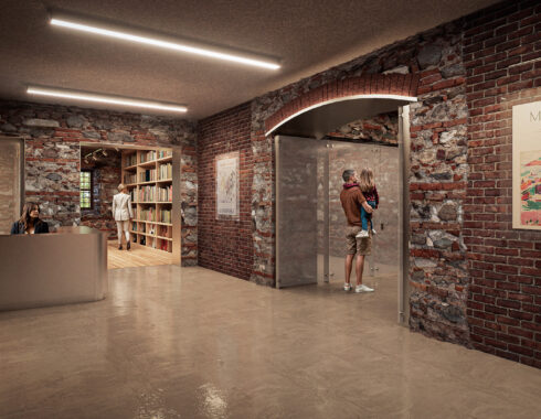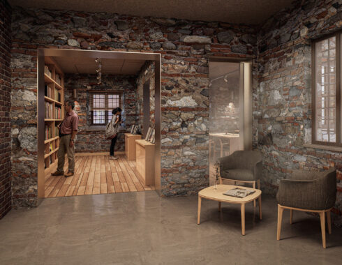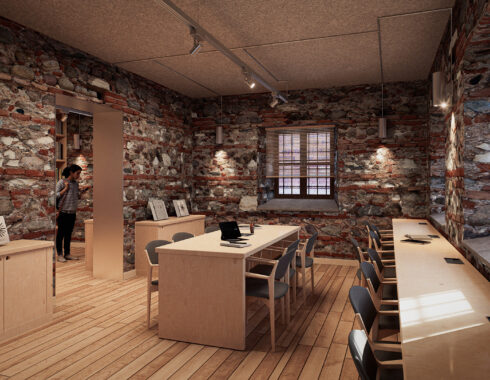 During the restoration process we undertook, the long-unused basement was repurposed into an exhibition and library area. Care was taken not to damage the original texture of the building; new spaces were created using permeable and lightweight materials. The exhibition areas depicting the history of Bursa and the library were designed in a complementary layout, with service units integrated into these areas.