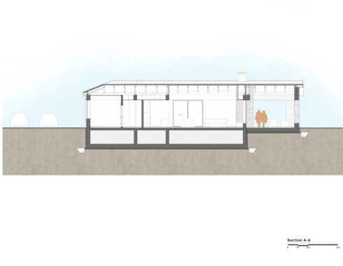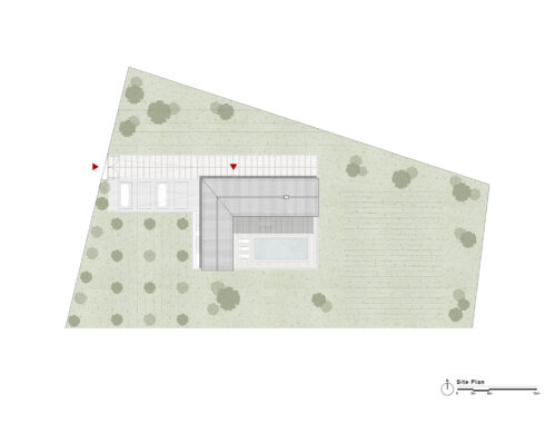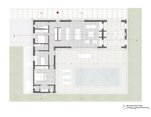 Cetin House consists of an L-shaped building creating a courtyard oriented towards southeast, and thus, protected from the northern winds. A steel pergola runs parallel with the long edge of the house and the swimming pool located at the center of the courtyard.