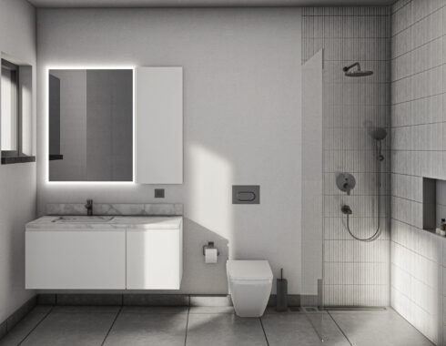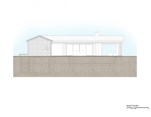The house can be reached from the west, through a forest road that connects with the vehicle and pedestrian access at the back. The western side of the house is reserved for the parking and the stairs that lead to the basement.