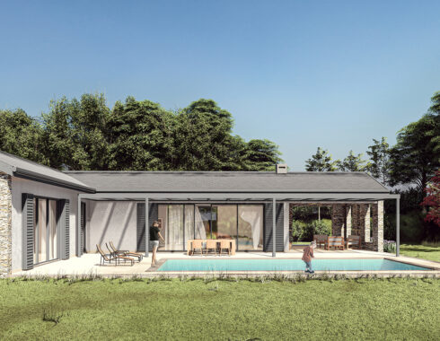 The eastern edge of the L-shaped building is reserved for the open living room. At the continuation of the living room, the roof is extended towards the garden, in such a way to obtain a covered veranda. The kitchen and the cloakroom are positioned at the intersection of the two edges, separating the private and public areas within the house. The three bedrooms are aligned along the other edge, with the main one at the end, looking directly at the swimming pool.