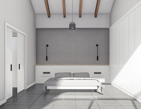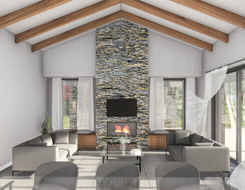 The timber roof structure is left exposed both in the living room and the main bedroom, maintaining the hierarchy between different spaces. The fireplace is clad with the same natural stone used on the facades, strengthening the relationship between inside and outside.