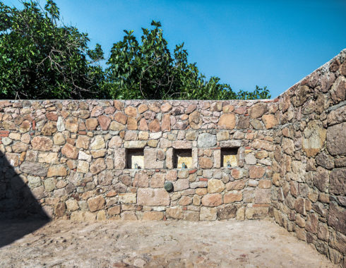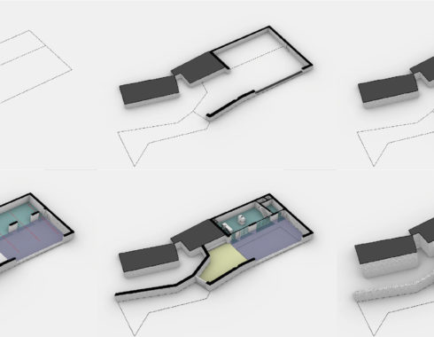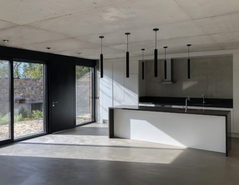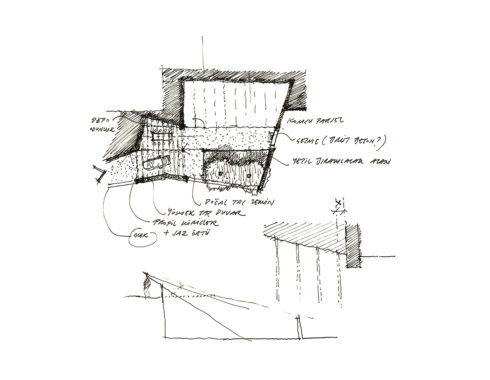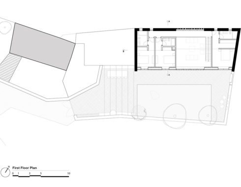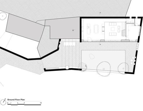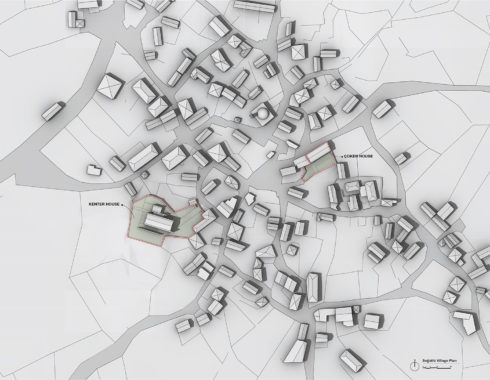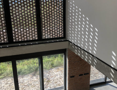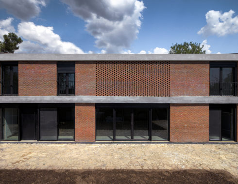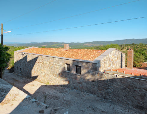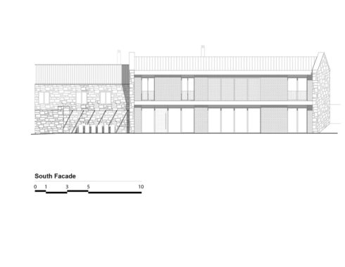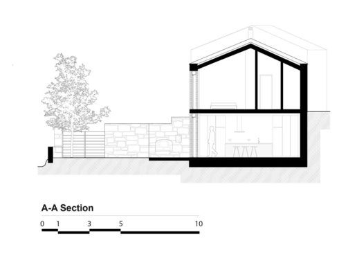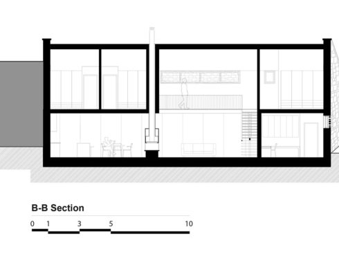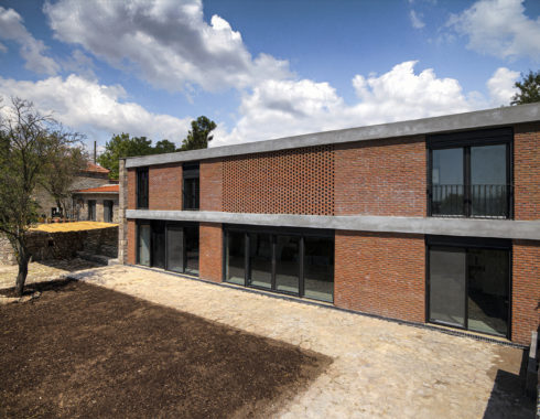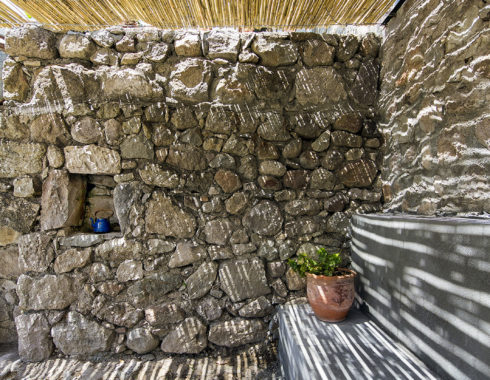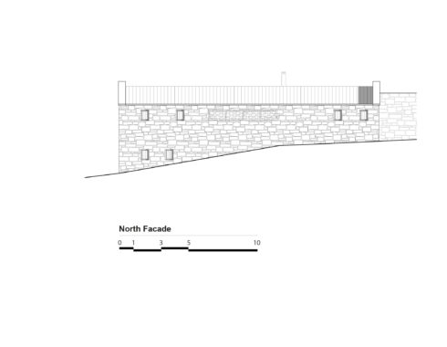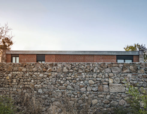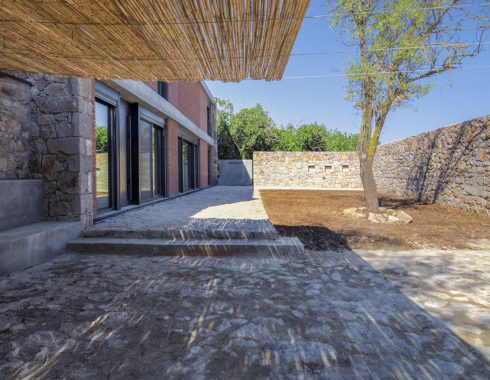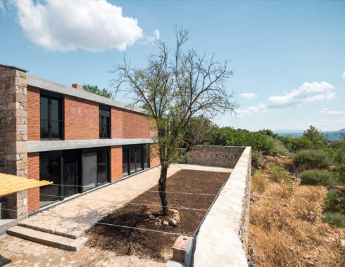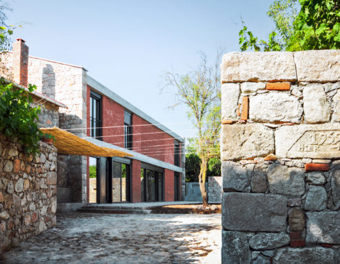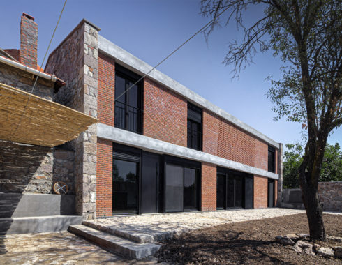Coker House is in Sogutlu Village, situated in Ayvacik, Canakkale. While positioning the house, the aim was to maintain the street line by continuing the existing series of buildings and to leave a garden area facing southeast. The house and the garden are entirely surrounded by a stone wall, with heights changing according to the location, containing voids and niches. The inside-outside relationship is built through a brick and glass wall, placed inside this stone envelope, which works as an interface. Ground floor is organized as an open space. Double storey high living room, located at the center of the house, is separated from the kitchen and the dining area, with a double-sided fireplace. Ceramics workshop, opening directly towards the garden with the help of a fountain, placed specifically for the host, who wants to hear the sound of water while working, is on the other side of the living room. On the upper floor, there are three bedrooms connected with a bridge overlooking the living room. In the building, the reinforced concrete is exposed and the overlapping of the shutter dimensions and façade modulation gives birth to a spatial rhythm. With the help of the modulated interface, interior spaces are associated with the garden. In order to maintain this association and to block the view from the neighboring garden sitting on an upper level, an open-air dining area, covered with reed, is conceived next to the garden wall.
