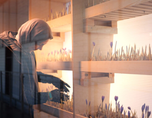 The installation at the Climate Museum which emerged as a result of the intersection of the production process of Aras Seddigh with Fateme Frootan’s new generation planting project where she applied alternative agricultural methods, establishes a post-modern link between scientific data and art production, acting on the principle of appropriation. In the installation, a soilless and waterless alternative space is created for the saffron bulbs to sprout in a cabinet, which can also be observed by the audience. Architect Ali Derya Dostoglu developed the cabin design of Seddigh’s experimental project together with the artist who applied the production method in a cabin environment for the first time based on Frootan’s work. The project proposes an alternative cultivation procedure by designing a mobile biotope (cabin) in which the seasonal environmental conditions are fulfilled, thus, wooden racks where saffron bulbs are placed stimulate the soil and isolate them from their natural habitat. In this way, in addition to the considerable reduction in water consumption, a large number of saffron bulbs find an opportunity to bloom in a smaller area in comparison to the soil.”