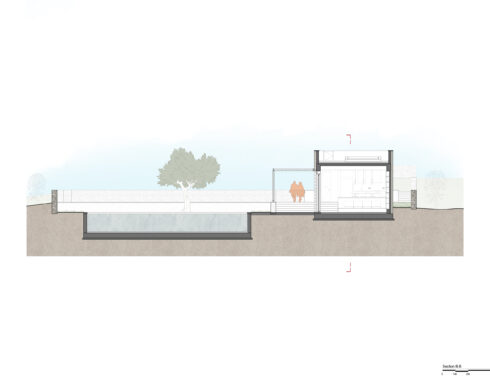 It is a one storey building with a rectangular shape, positioned along the southern edge of the site, allowing to obtain a decently sized garden towards the north, which contains a long swimming pool perpendicular to the house.