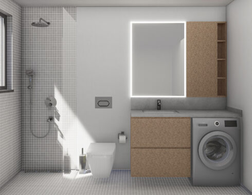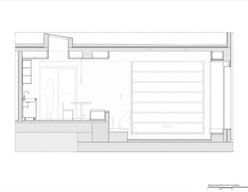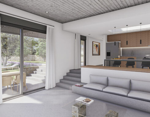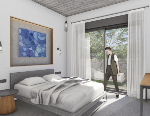 In terms of material palette, CSD House is quite modest: Two side walls along the long edges are covered with natural stone, whereas the front and back facades are left in plaster and paint. The natural stone is pierced with frames, also in plaster and paint, where windows and doors are located. The idea of using frames continues in the interior space as well, around the large window looking towards the sea and the library in the living room, along with the niches in the hallway and the main bedroom.