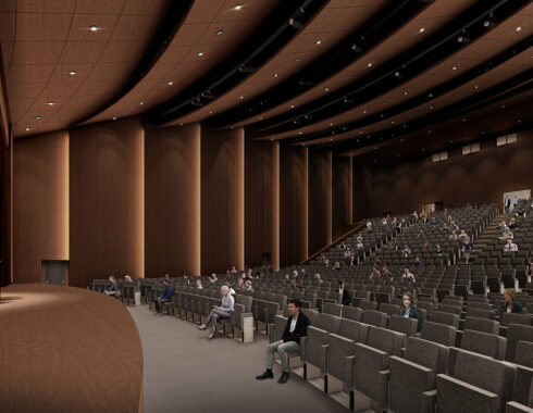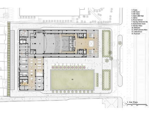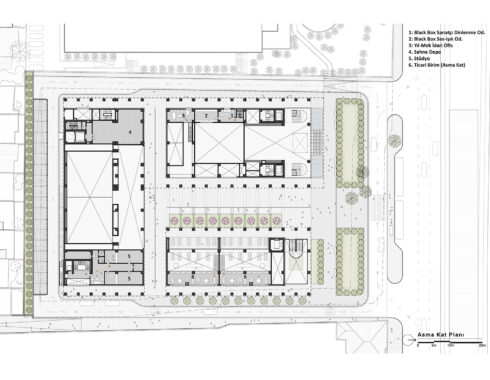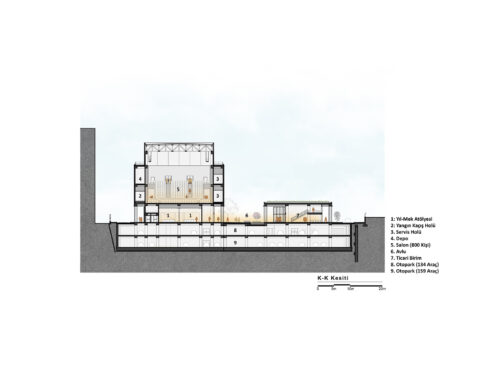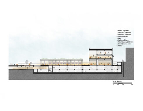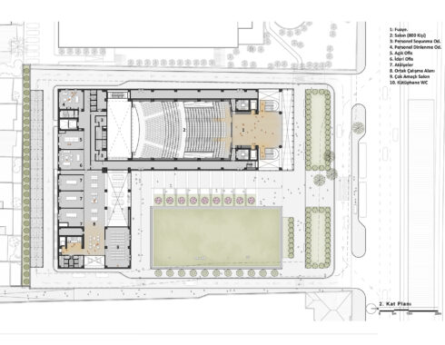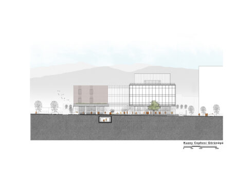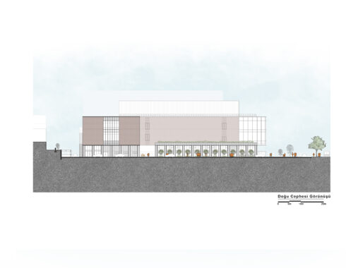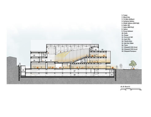 In the shaping of the three blocks surrounding the courtyard, the height and alignment of the buildings on the neighboring plots were taken into consideration. The first block, facing Ankara Yolu Street, contains the black box and the main concert hall. Two wedding halls are located on the ground floor of the second block, extending along the south side of the plot. The upper part of the wedding halls will be used as a library. In order to keep the courtyard alive and generate income at the same time, the ground floor is reserved for commercial functions.