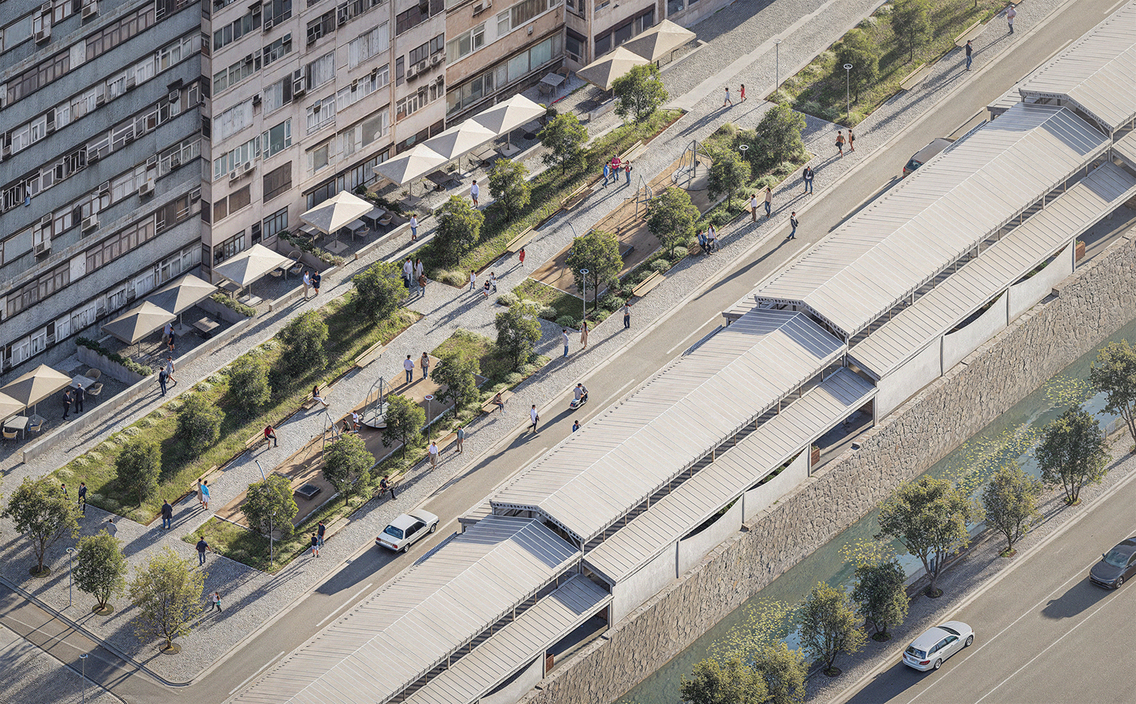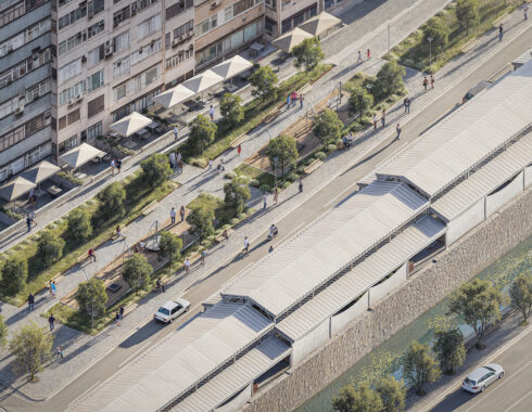 The second part of the project consists of the creation of a new recreation area, between the bazaar structure and apartment buildings on the other side. Following the moving out of the existing repair shops, the area will be reorganized as a linear park, including pedestrian ways and activity zones. In parallel with the creation of the park, the ground levels of the apartment buildings looking towards the recreation area, are reserved for cafes, restaurants and various retail units. This way, it is aimed to produce a lively urban environment.