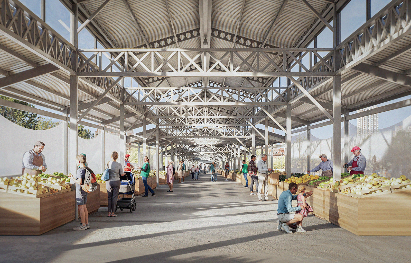 Our refurbishment proposal is based on the idea of reclaiming the existing structure by adapting it to the needs of the stallholders and the shoppers. We are suggesting to add an additional series of steel columns running parallel with the existing structure. The stallholders are positioned between existing and new columns, facilitating the circulation of the shoppers in the middle. Also, the roof is lowered towards these new columns, allowing to be protected against the wind, the rain and the sun. Besides, stallholders are able to cover their backs by tying their own fabric to the hoops on the new columns. Along the edges between the upper and lower parts of the roof, we proposed horizontal windows, with polycarbonate panels. These windows both increased the daylight inside the bazaar and protected the main pedestrian circulation from the rain. Finally, we suggested to increase the heat insulation to help with the comfort of both the stallholders and the shoppers. The use of the color white helped us give the structure a feeling of lightness, while also bring forward the exhibited products.