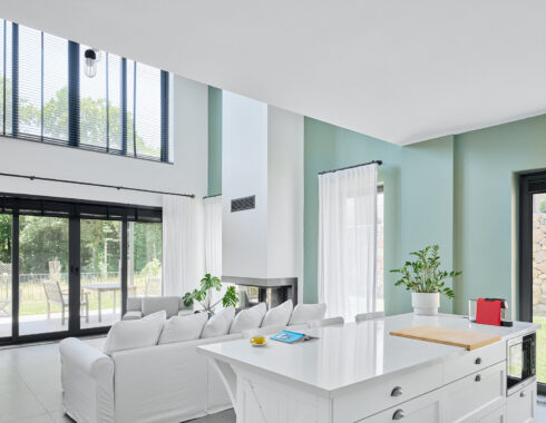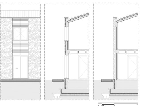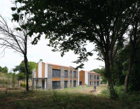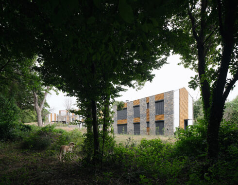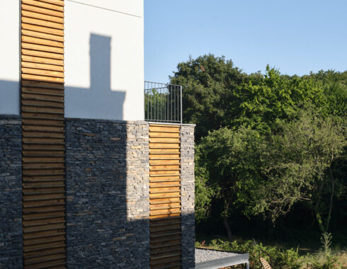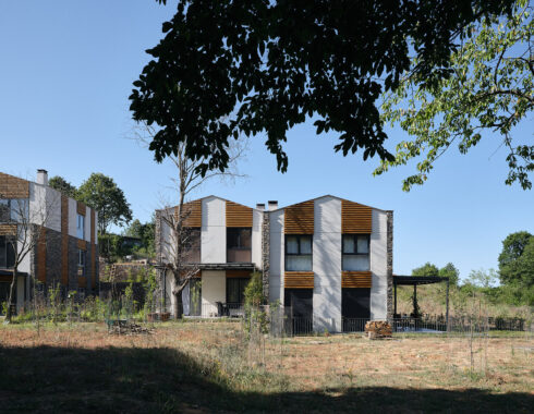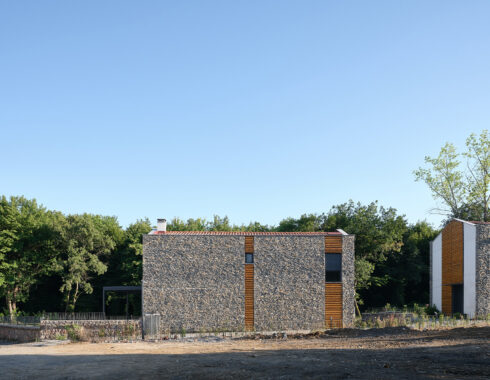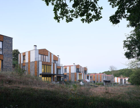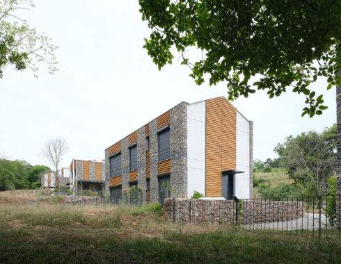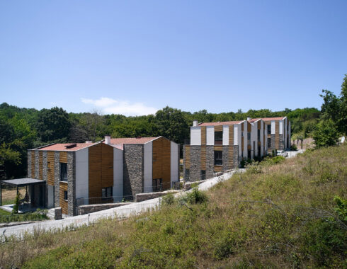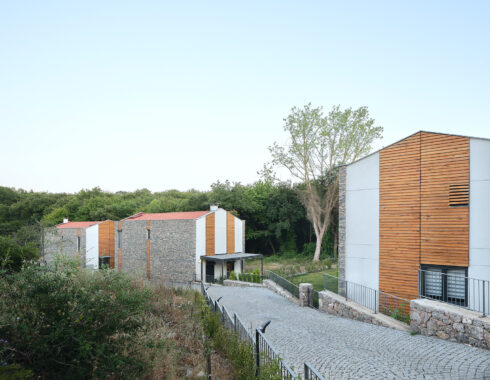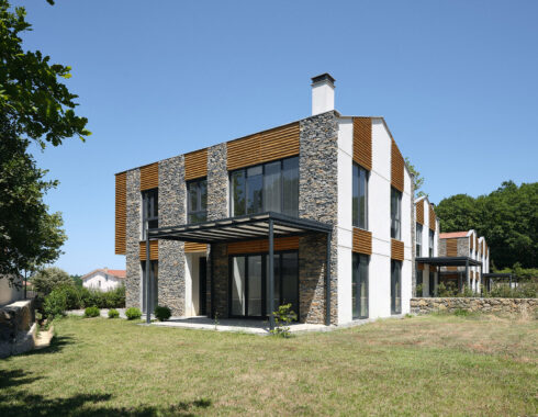 All the thirteen villas are using the same material palette: The side facades are finished with slate stone, while the front and rear facades are completed with porous plaster and off-white paint. Horizontal timber elements are used at window level, functioning as both façade cladding and sun-shading devices, establishing a balanced relationship with the slate stone. All villas feature verandas with steel structures.