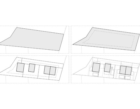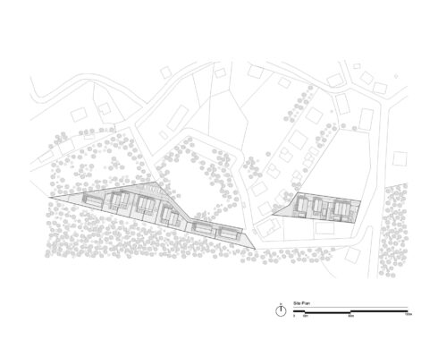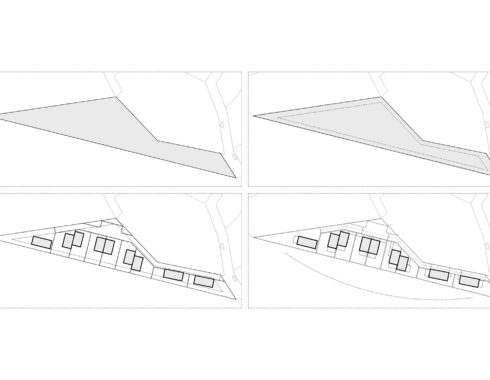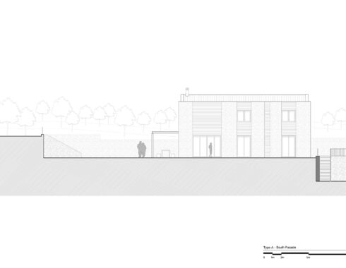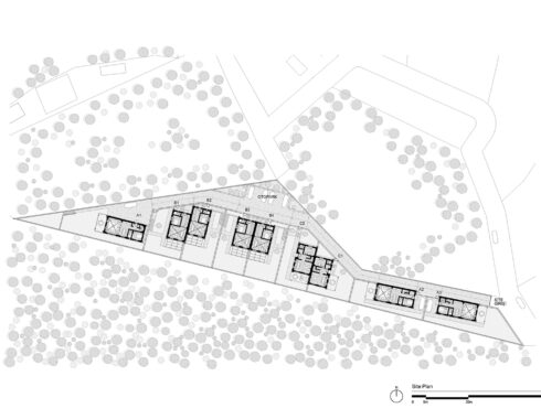 In the first site, all the villas are looking towards the forest. Because of the shape of the site, which narrows down towards the ends, type A villas are positioned in parallel with the site’s long edge. In contrast, towards the middle part, where the site’s depth increases, type B and C villas are positioned perpendicular to that edge, towards the forest. The car access is kept at the back, in such a way to liberate the connection between the gardens and the forest.