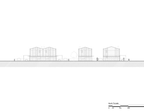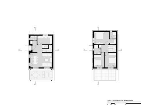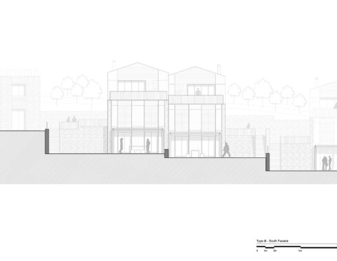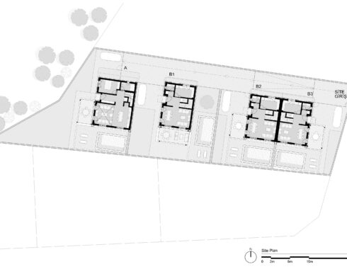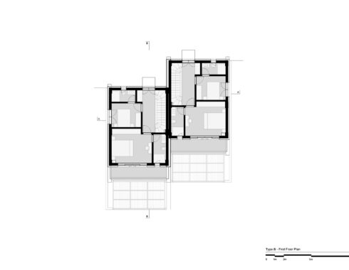 In the second site, the four villas are positioned perpendicular to the site’s long edge. Like the first site, the car access is at the back. All the villas are duplex, nevertheless, type A villa is bigger than type B villas. It has a bedroom on the ground floor, and two bedrooms and a hall on the first floor. In contrast with the type A villa, type B’s have closed kitchens. They have three bedrooms on the upper floor, however, they lack a double storey high living room, due to the limited floor area.