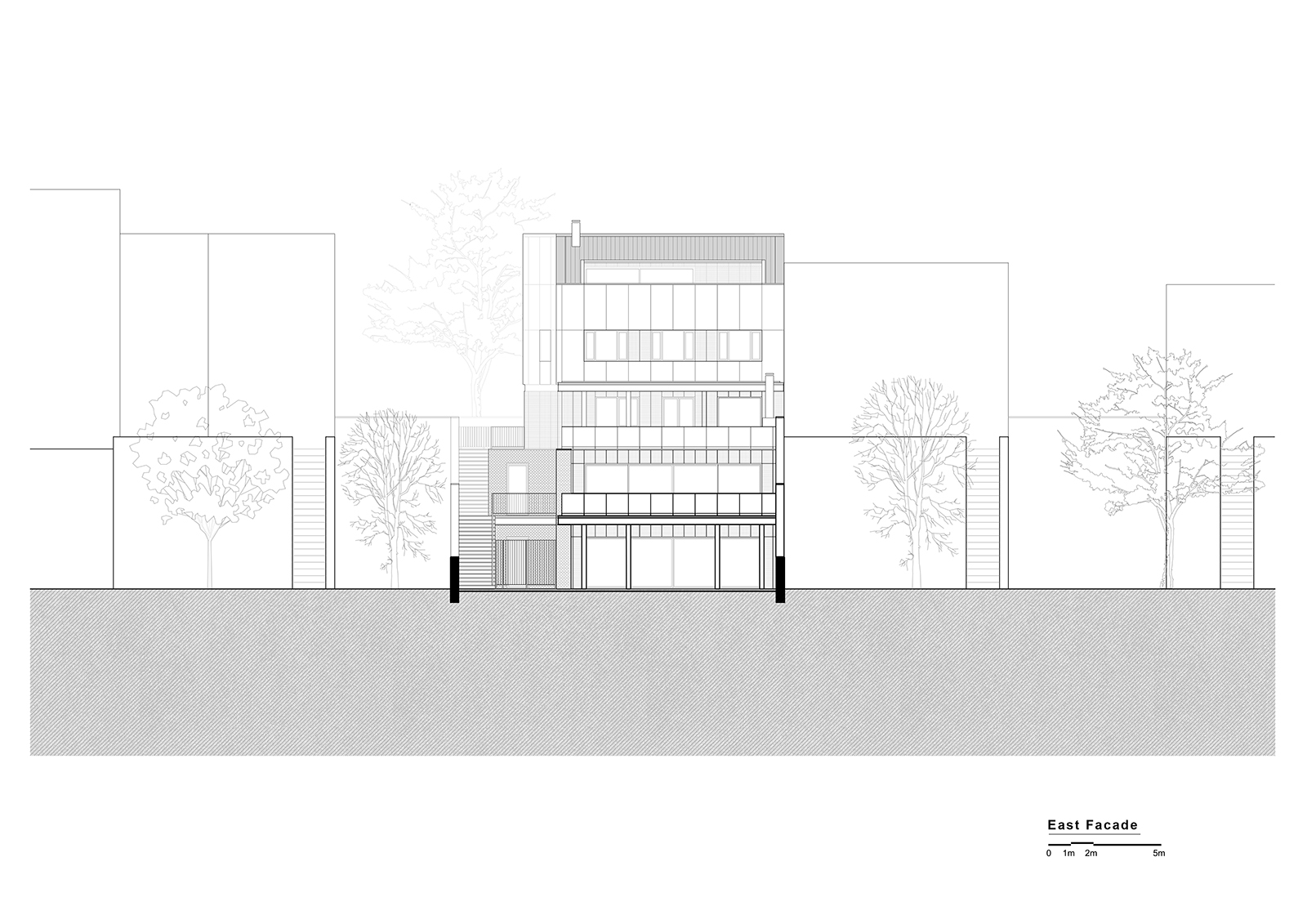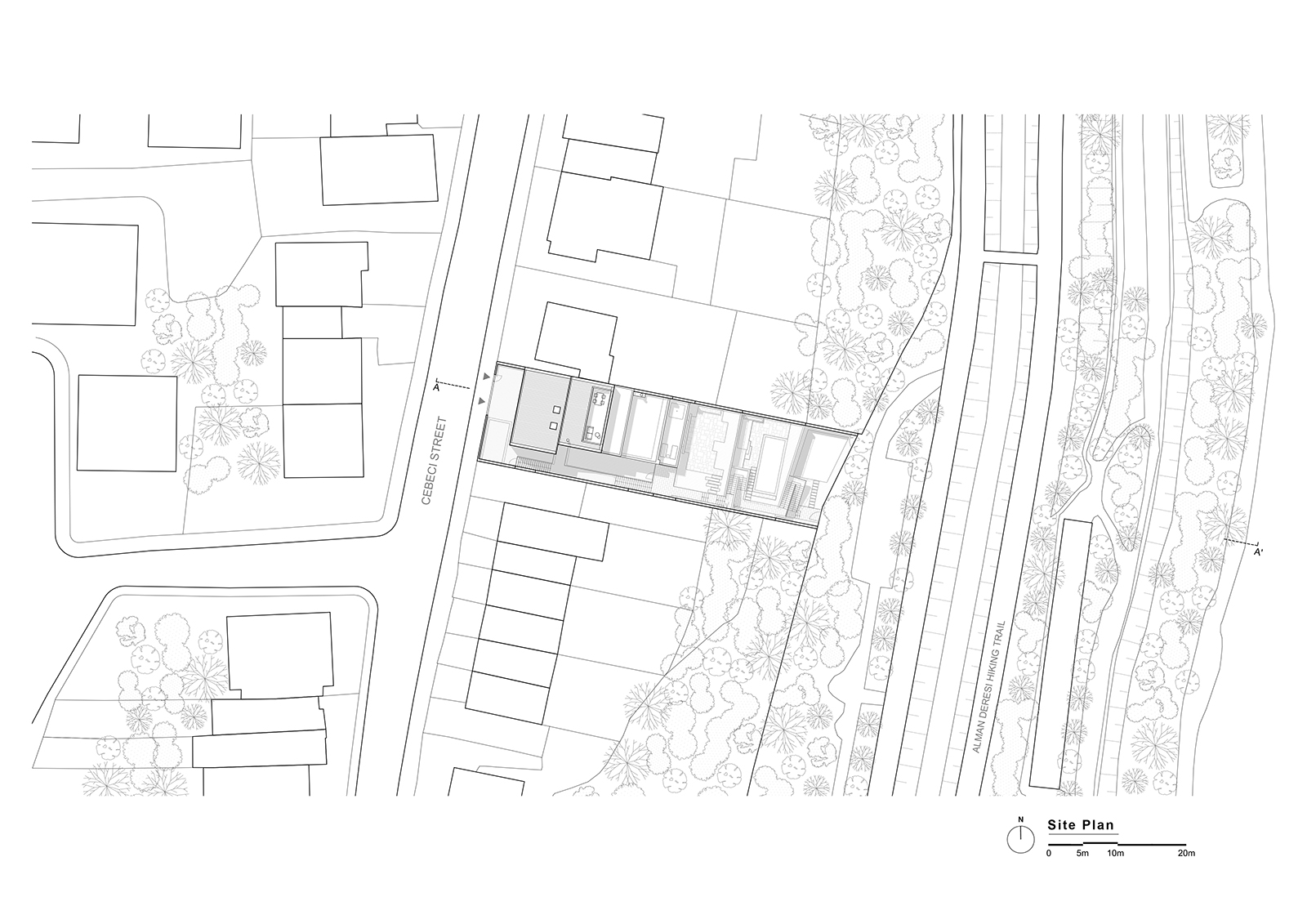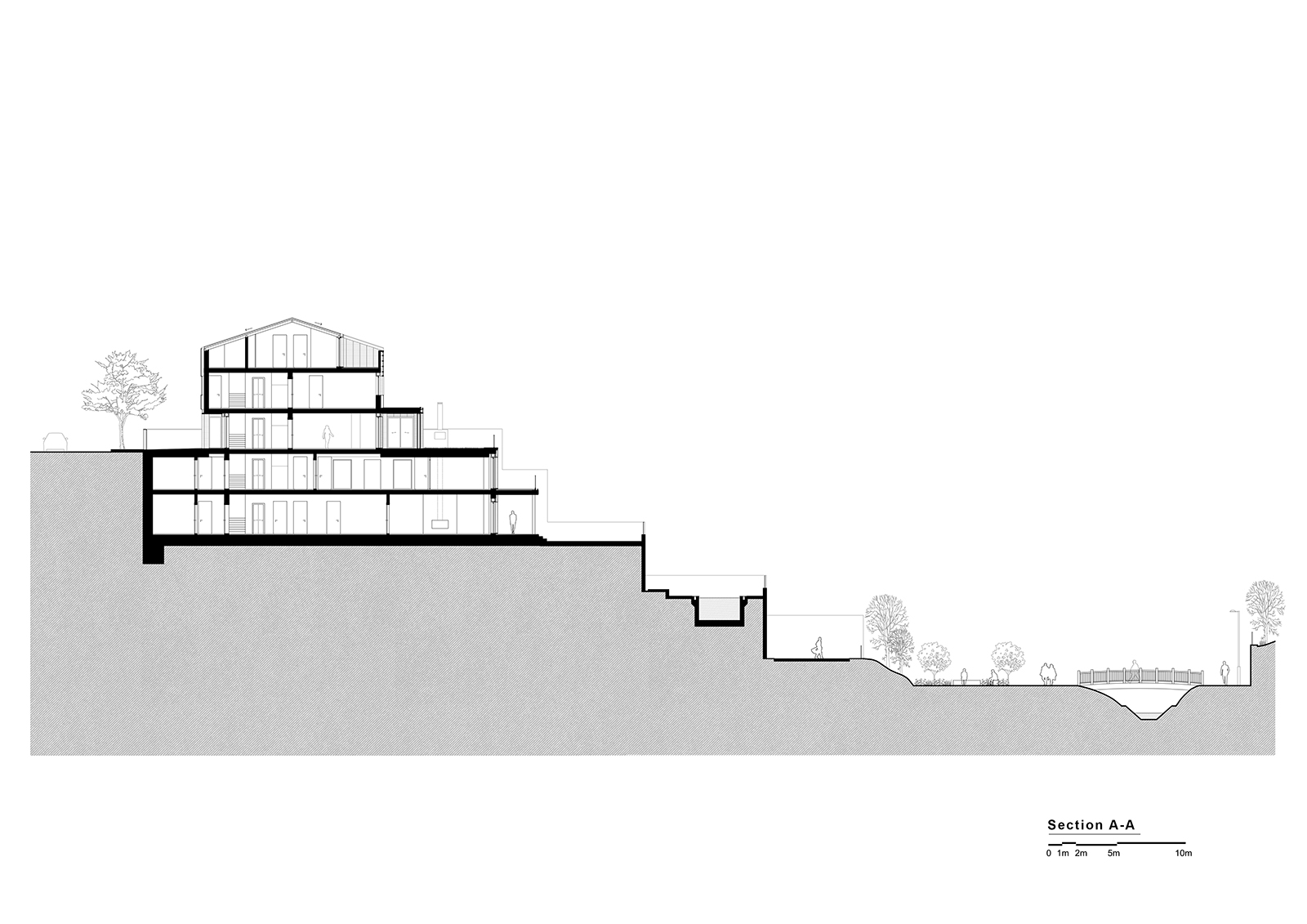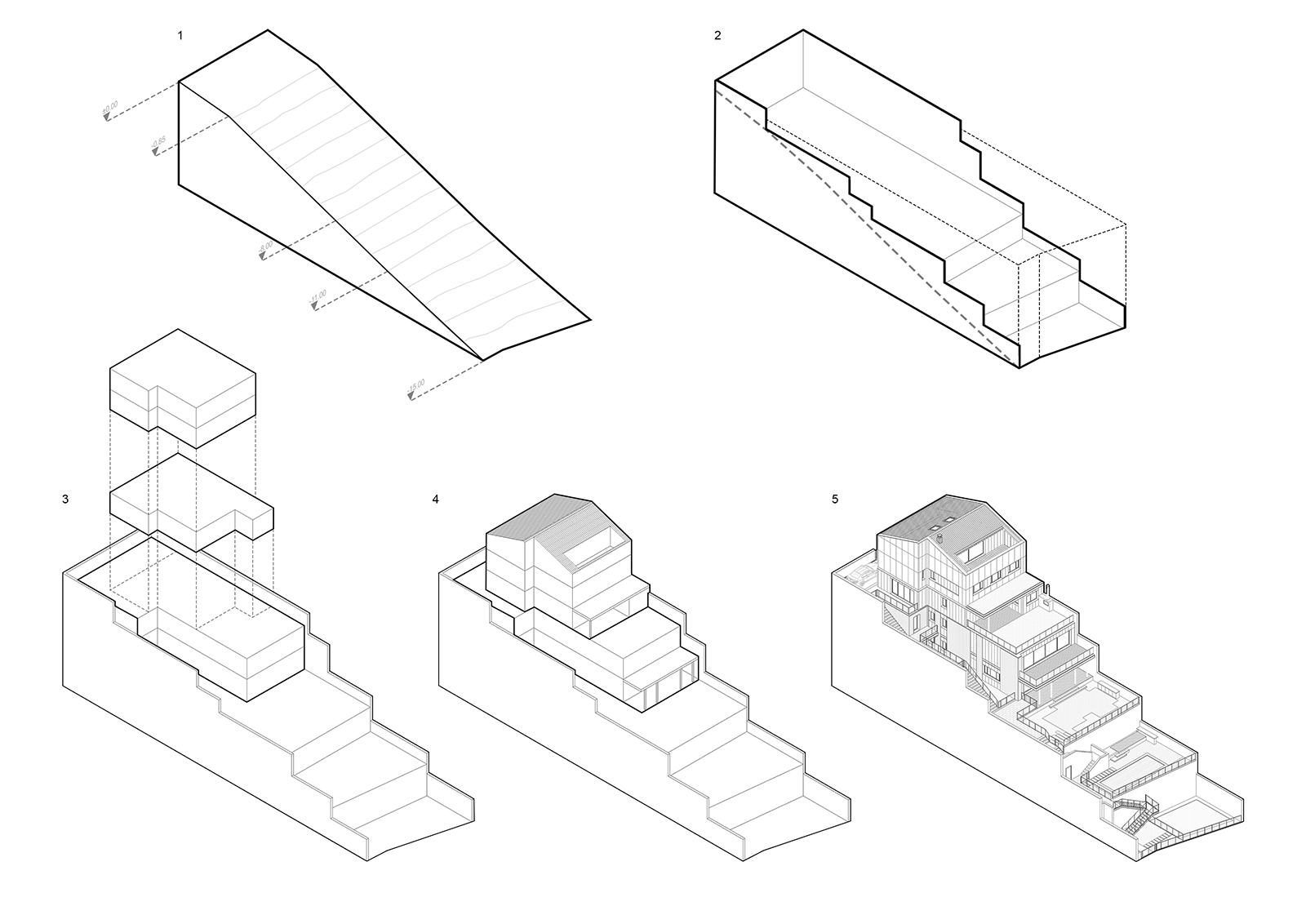 The 15-meter elevation difference between the upper and lower edges of the plot is one of the main elements that shaped the design. This difference has been leveraged to create spatial continuity and experiential variety through functions organized on different levels.