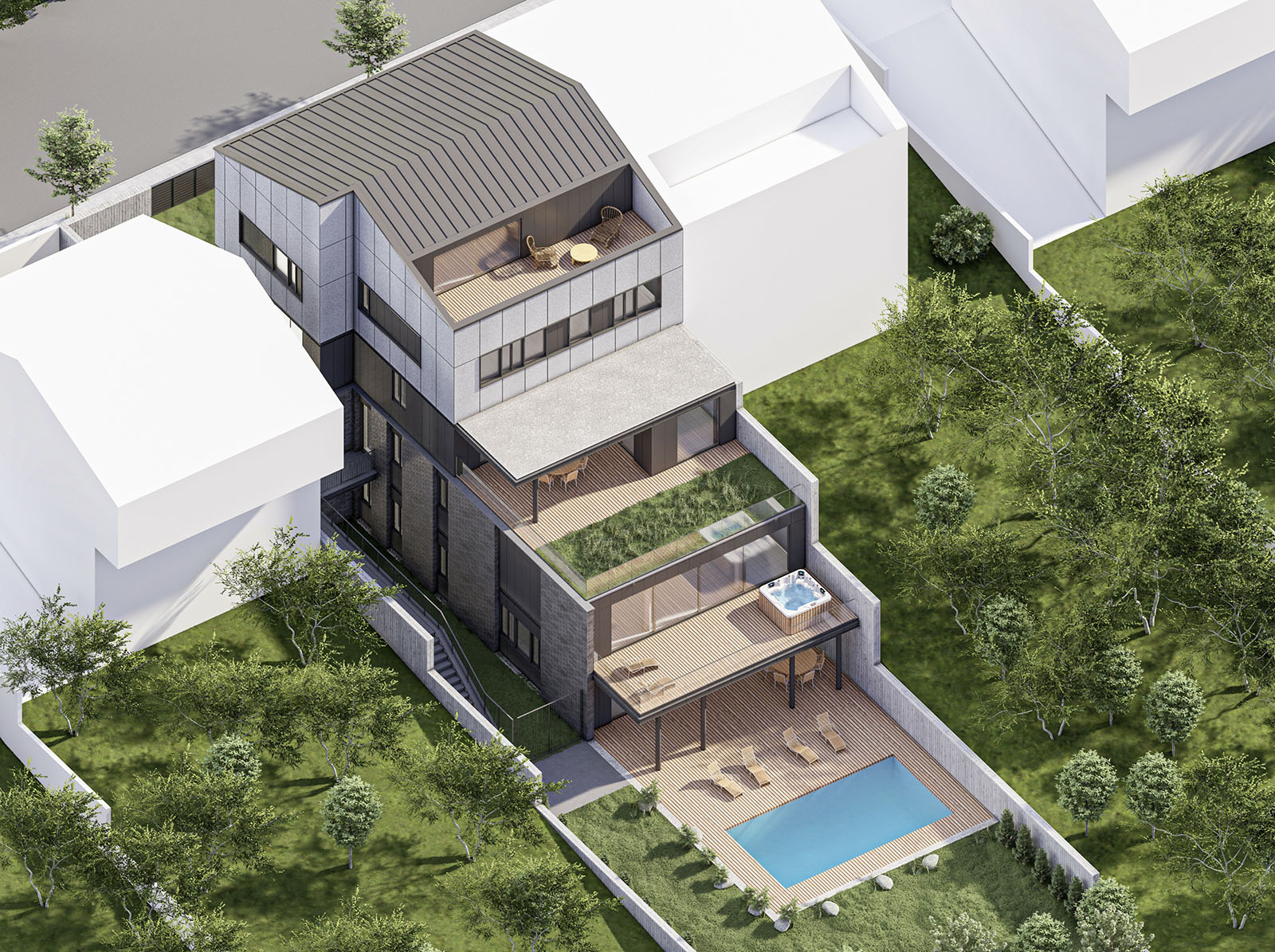 The user’s daily habits and individual requirements are at the core of the design. Key features that define the functional diversity of the house include a car elevator, a side garden designated for the dogs, meeting and staff rooms with independent entrances, and a private study located on the rooftop. The view of the Alman Stream and the adjacent walking park, accessible from all levels, offers a serene living atmosphere that blends nature into the urban center.