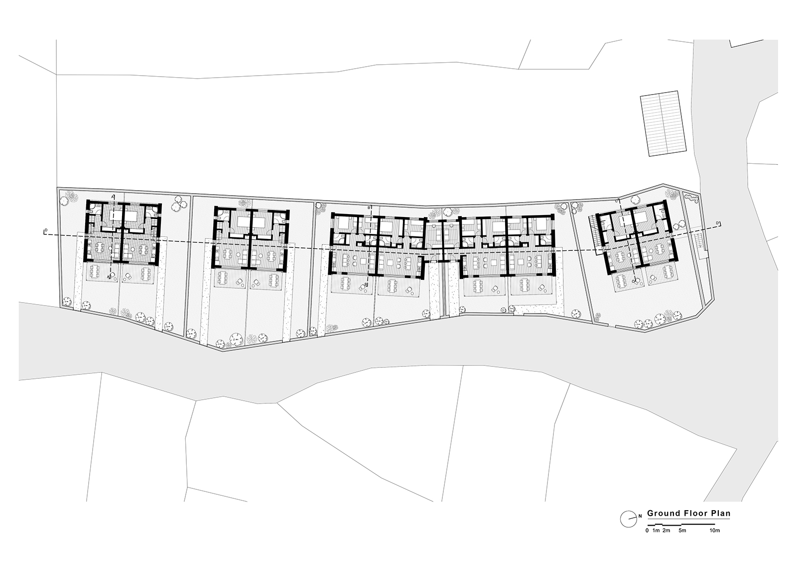 The project consists of 12 housing units, each with its own private garden, carefully positioned according to the natural slope of the land. The buildings are arranged in a stepped layout, oriented to the east, maximizing sunlight exposure, views, and privacy for each unit.