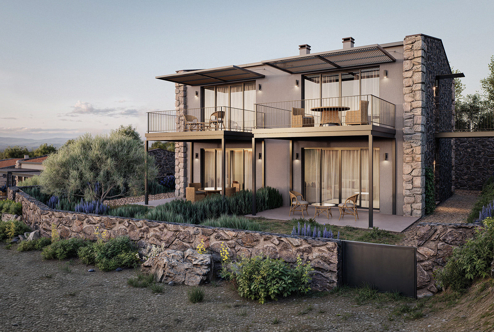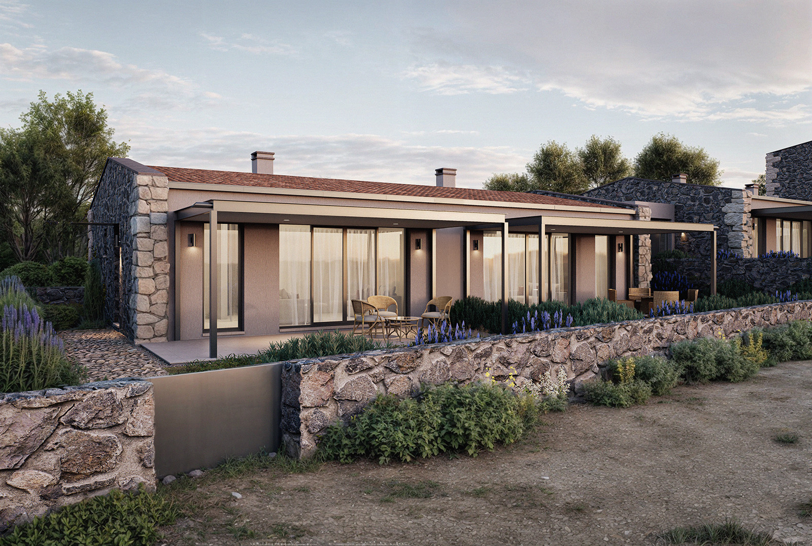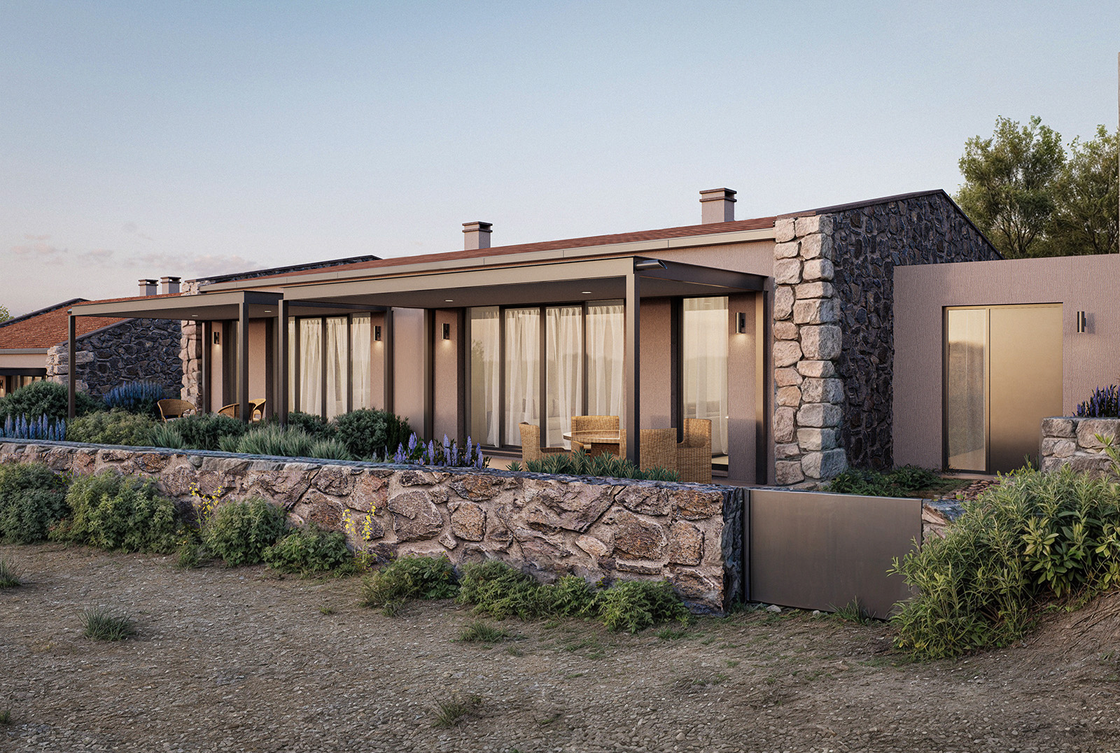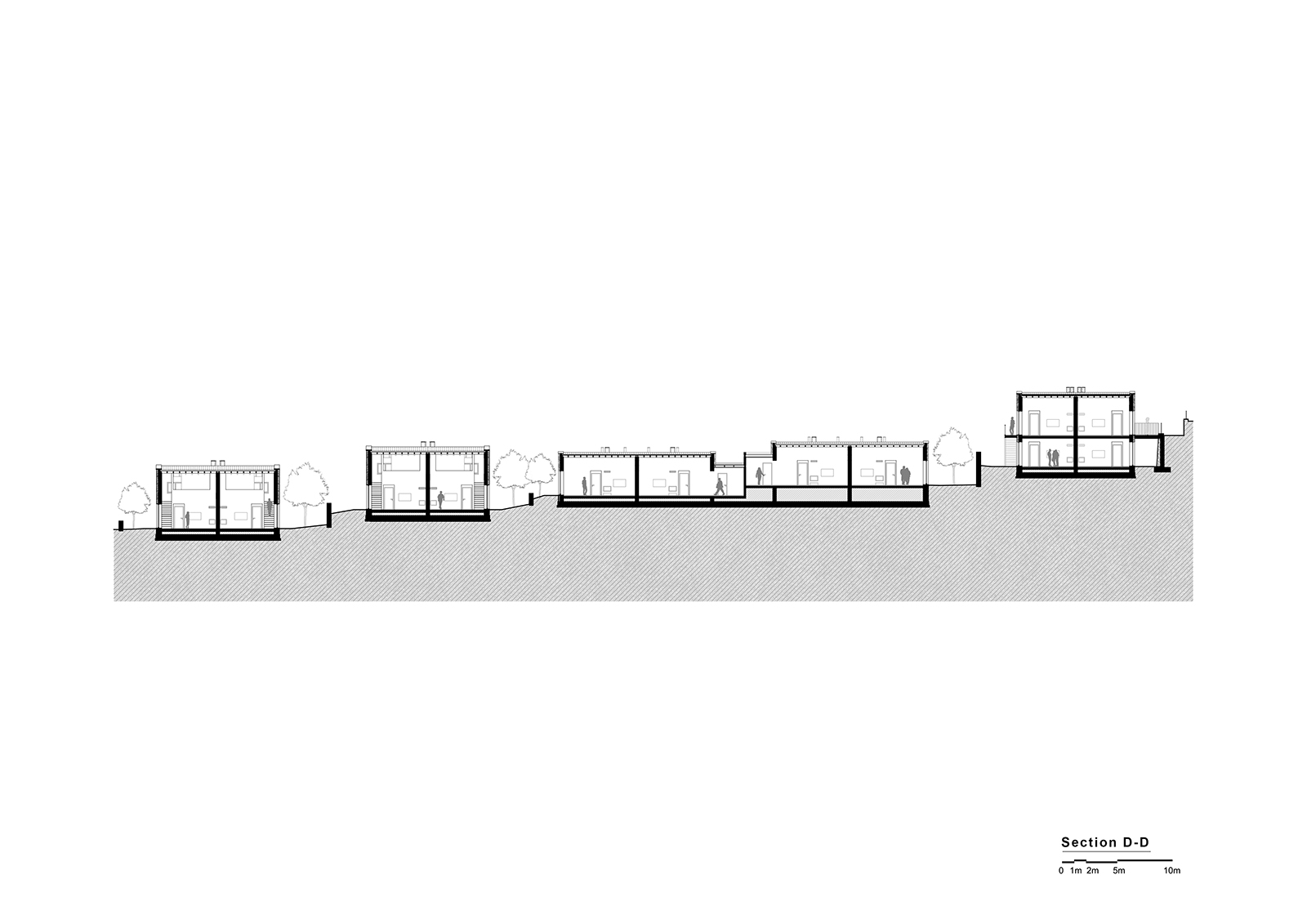 – Single-storey twin houses, where the natural slope is used strategically to enhance the separation and individuality between the paired units,