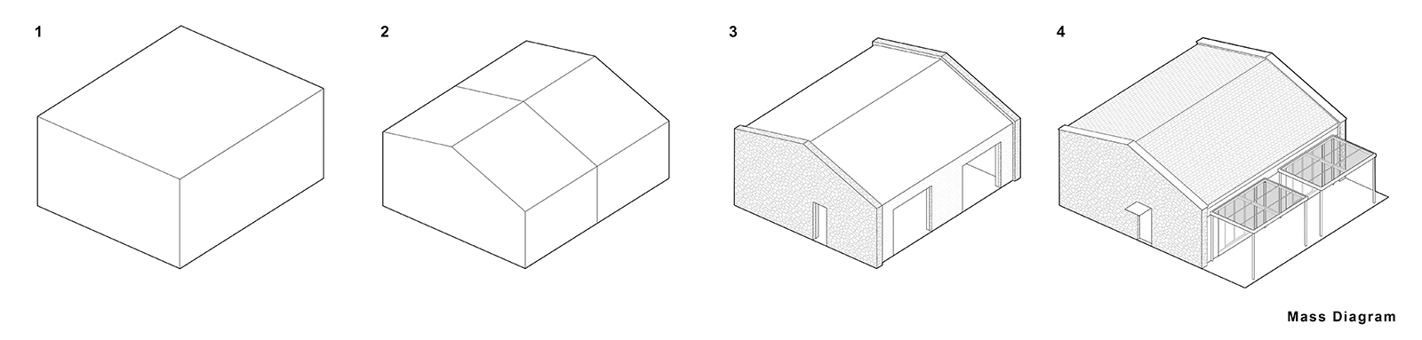 The material strategy reflects local building traditions by using local stone on the side facades and plaster on the front and rear facades, both chosen to harmonize with the natural setting.