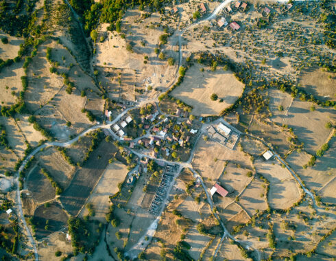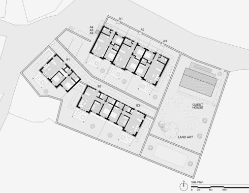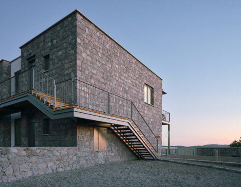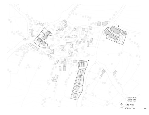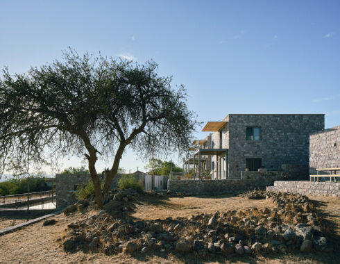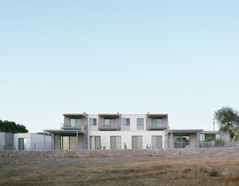 Adjacent to the houses, there is a land installation called “Prayer Space”, created by artist and architect Sinan Logie under an existing wild pear tree. Ormos Tartisik Guesthouse, designed to host various events throughout the year, faces the horizon through this installation.