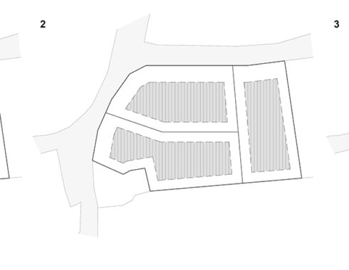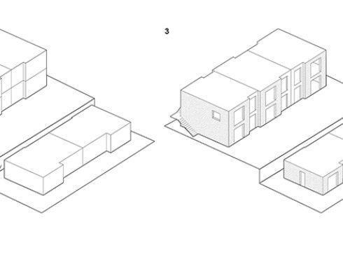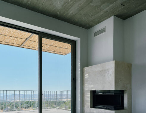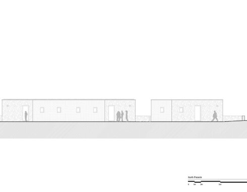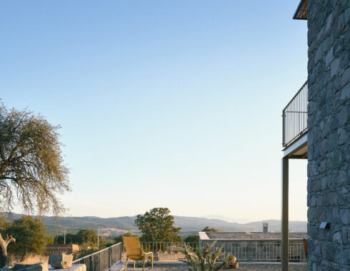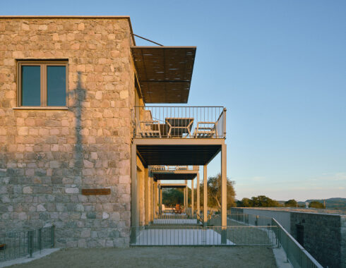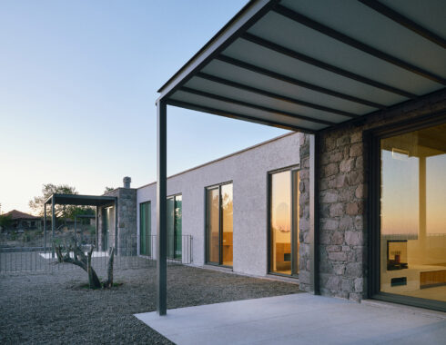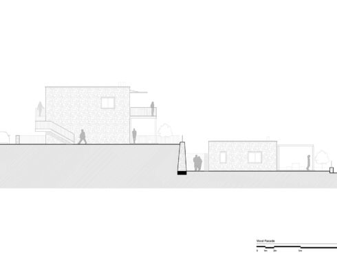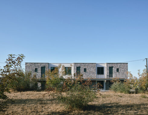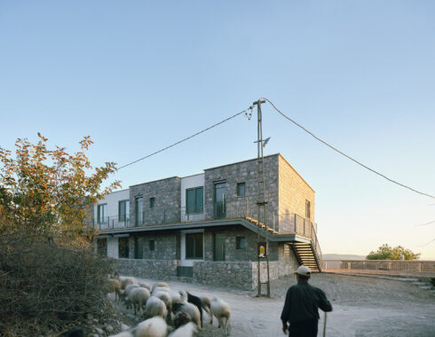 In both the rear apartment block and the front houses, façades clad in natural local stone are complemented by rough plaster-and-paint surfaces, adding textural richness to the exterior while harmonizing the buildings with the village’s original character. The articulation of the façades, aligned with the functional layouts, combined with the variation in materials, also contributes to the overall scale of the buildings.