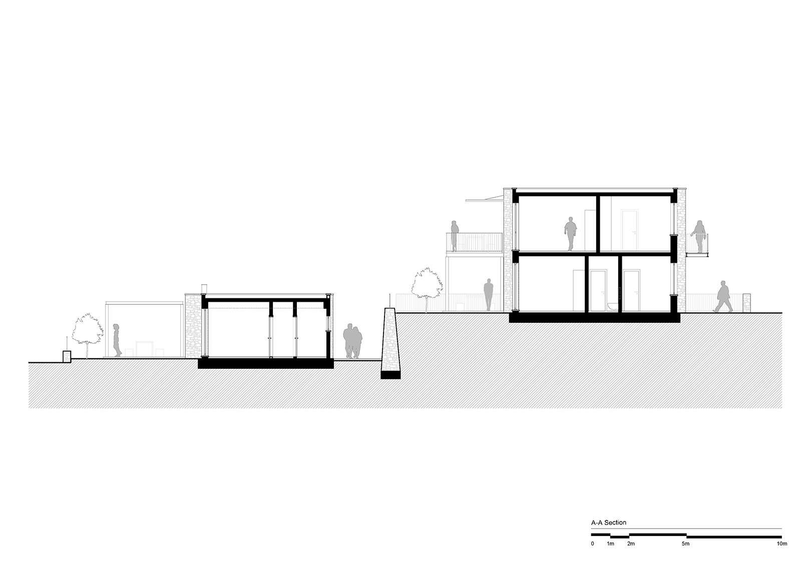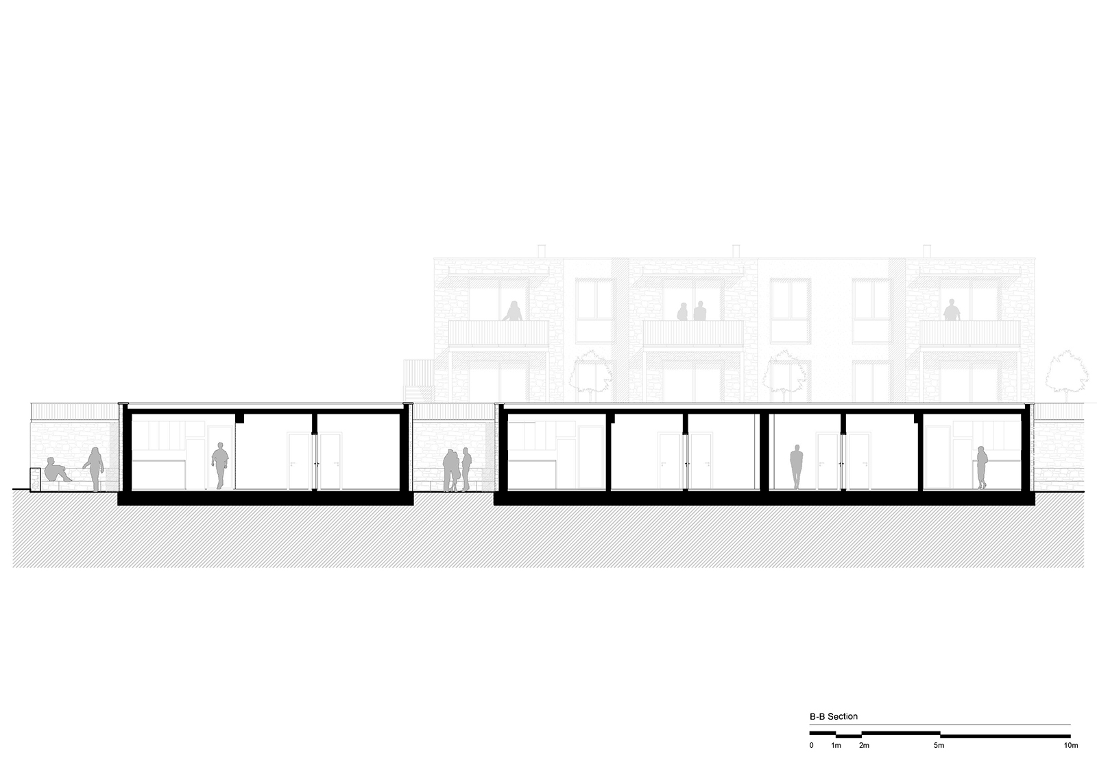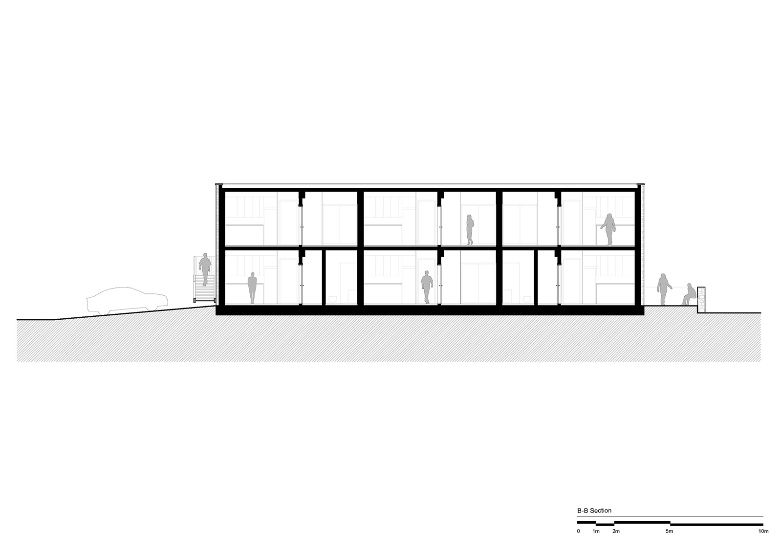The upper-floor apartments are accessed via a staircase located at the short end of the block and an open corridor running along the rear facade. Unlike the lower-floor apartments, which open directly onto the garden, these apartments connect to the outdoors through spacious balconies. These balconies also serve as a roof for the verandas of the lower-floor units. Access to the lower-floor apartments and the front single-story houses is provided from the rear facades.