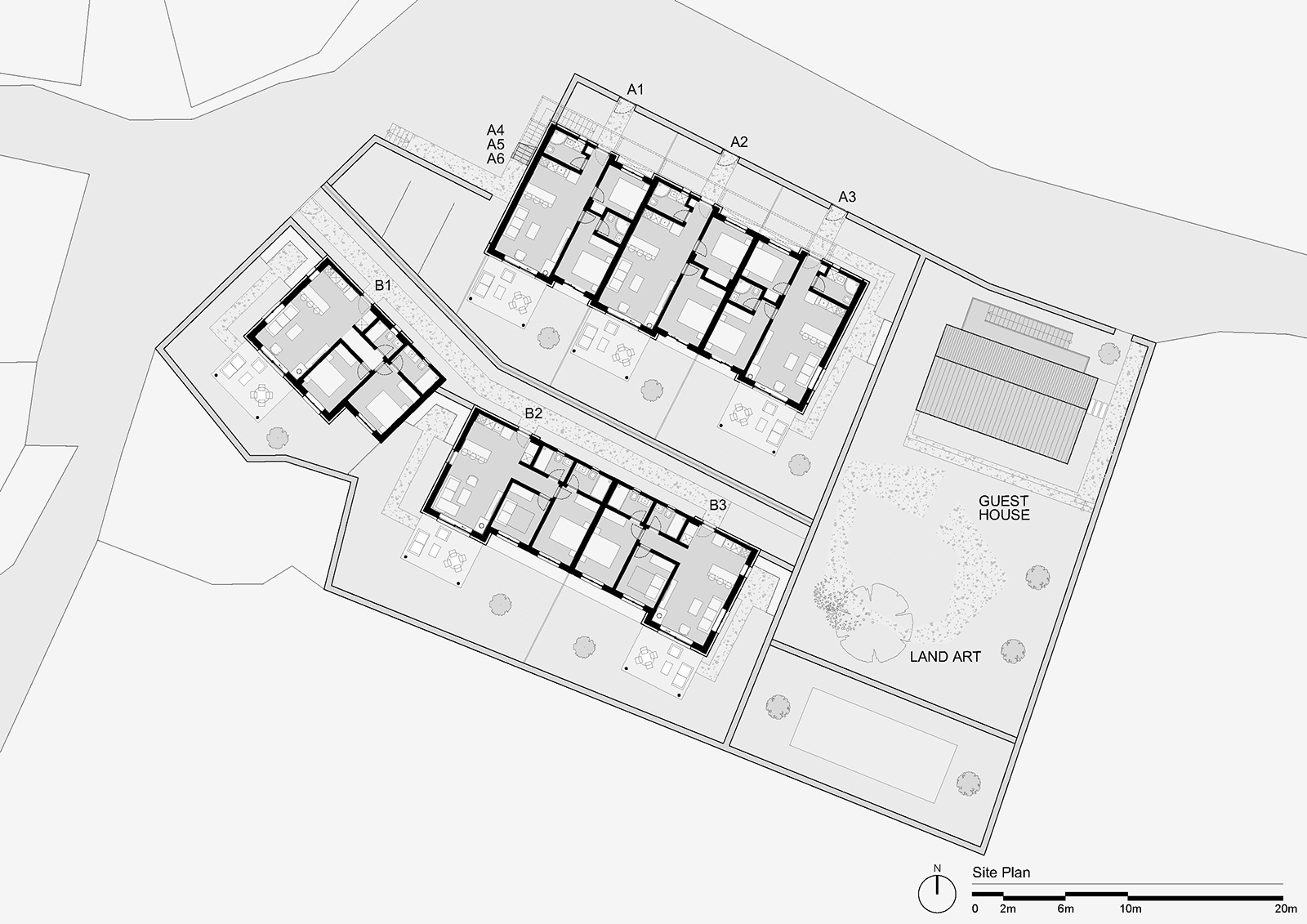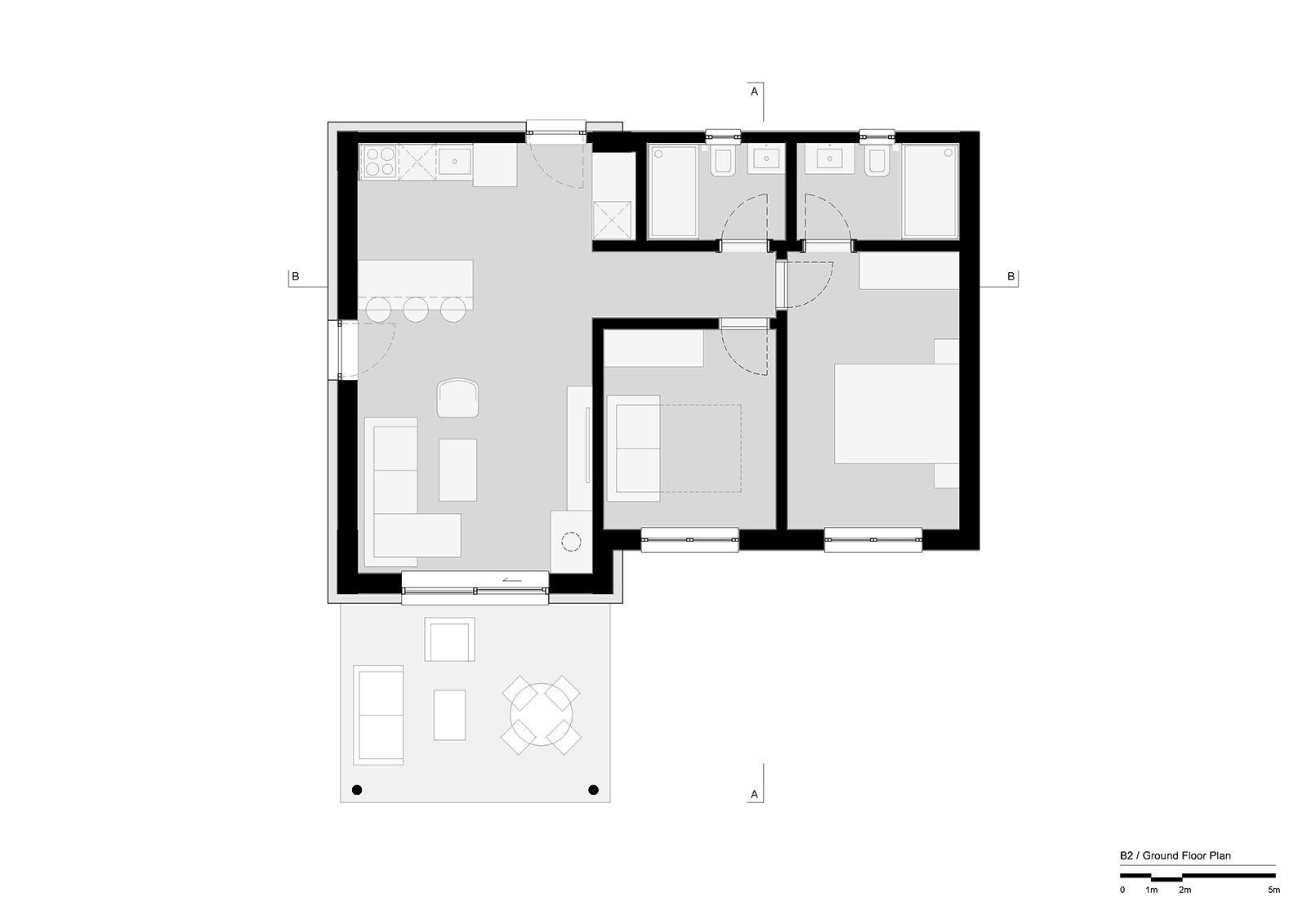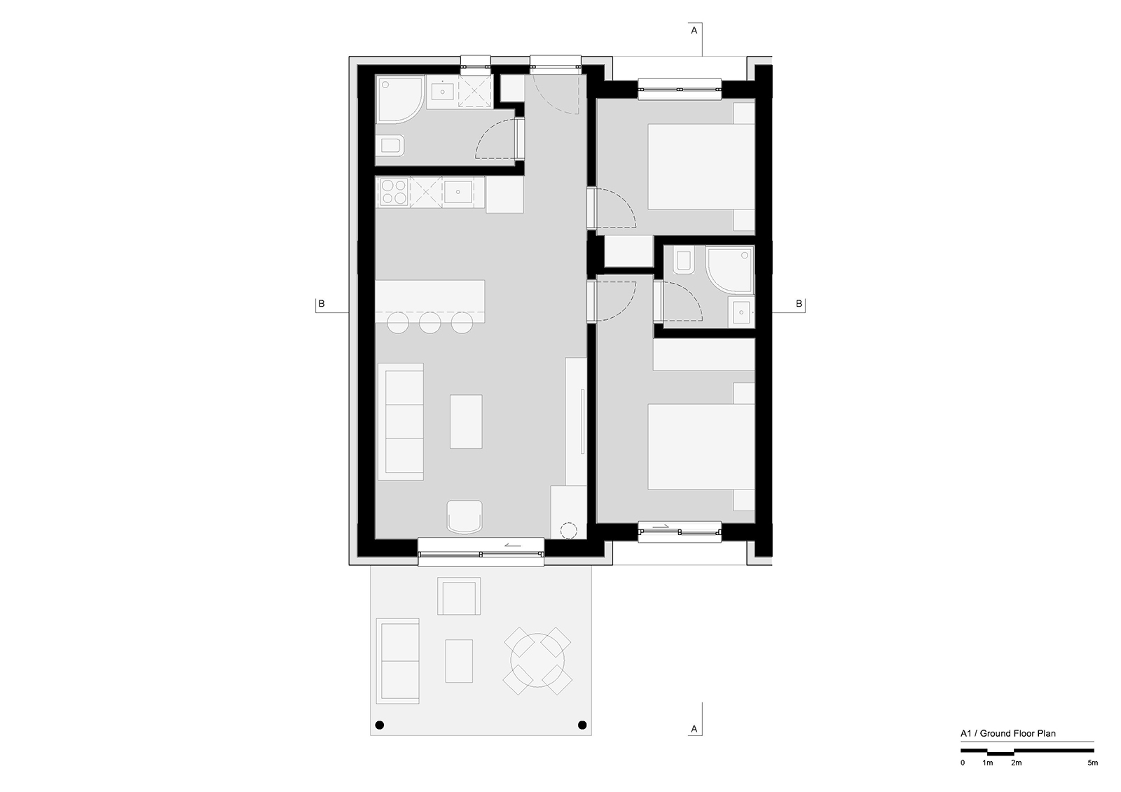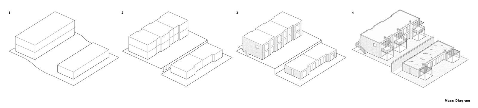 The upper-floor apartments are accessed via a staircase located at the short end of the block and an open corridor running along the rear facade. Unlike the lower-floor apartments, which open directly onto the garden, these apartments connect to the outdoors through spacious balconies. These balconies also serve as a roof for the verandas of the lower-floor units. Access to the lower-floor apartments and the front single-story houses is provided from the rear facades.