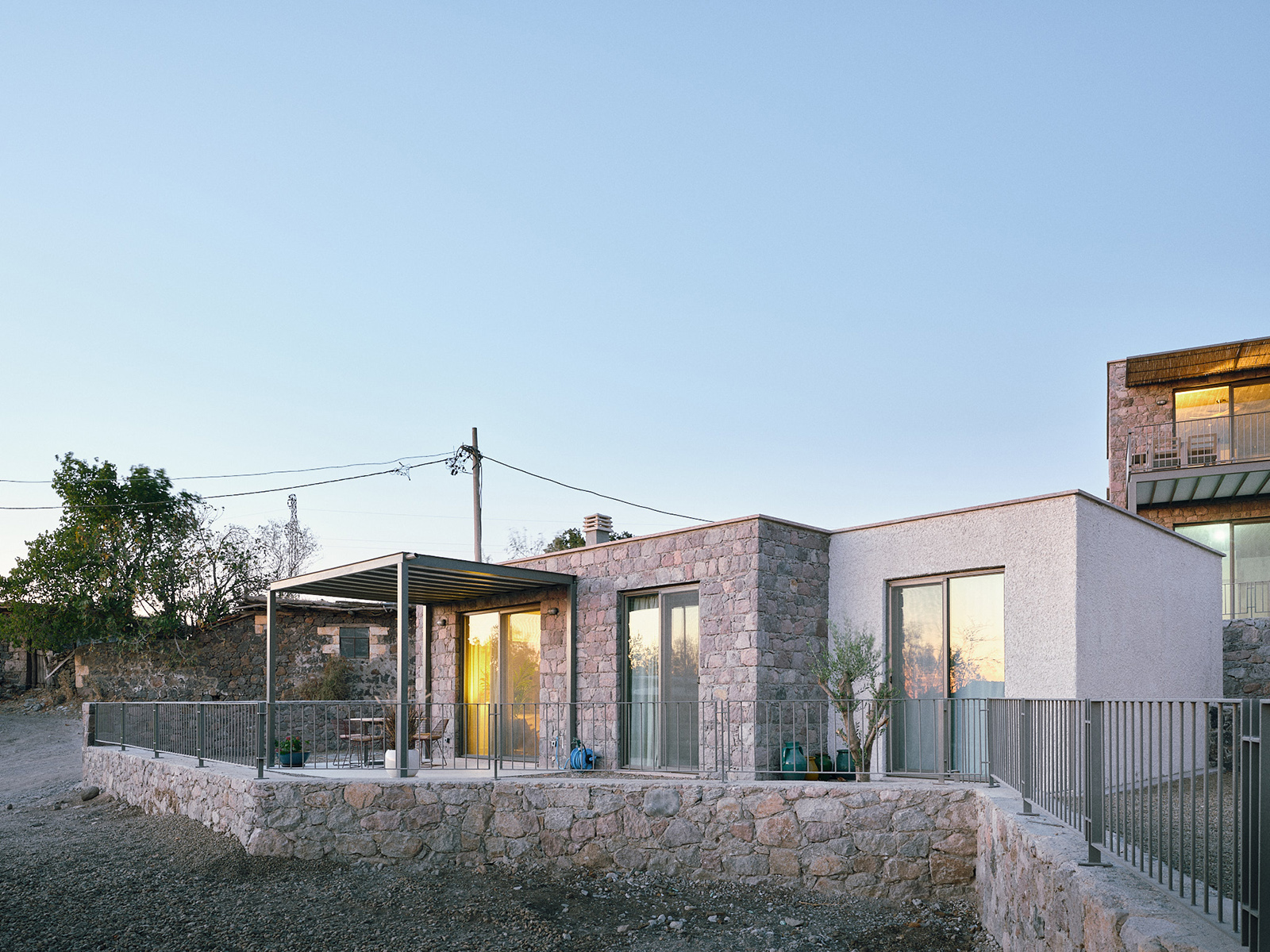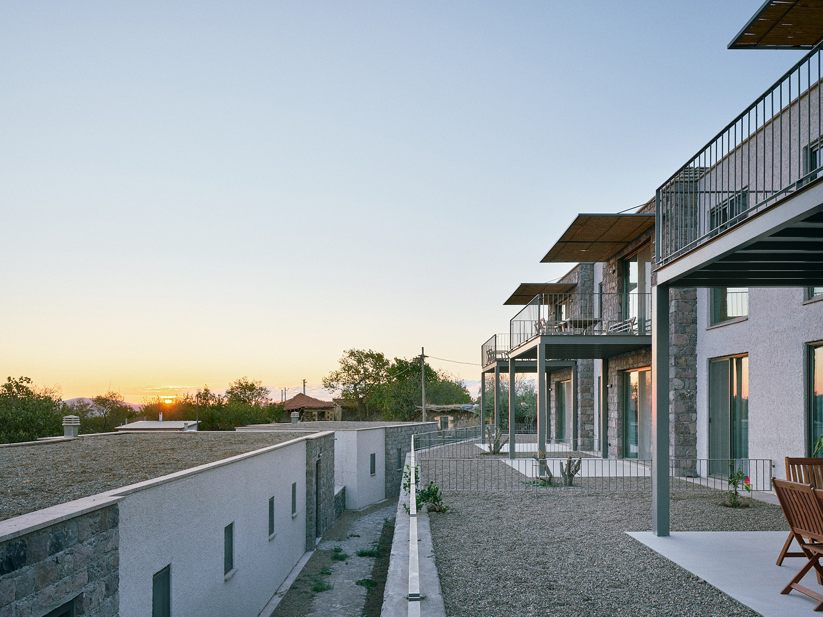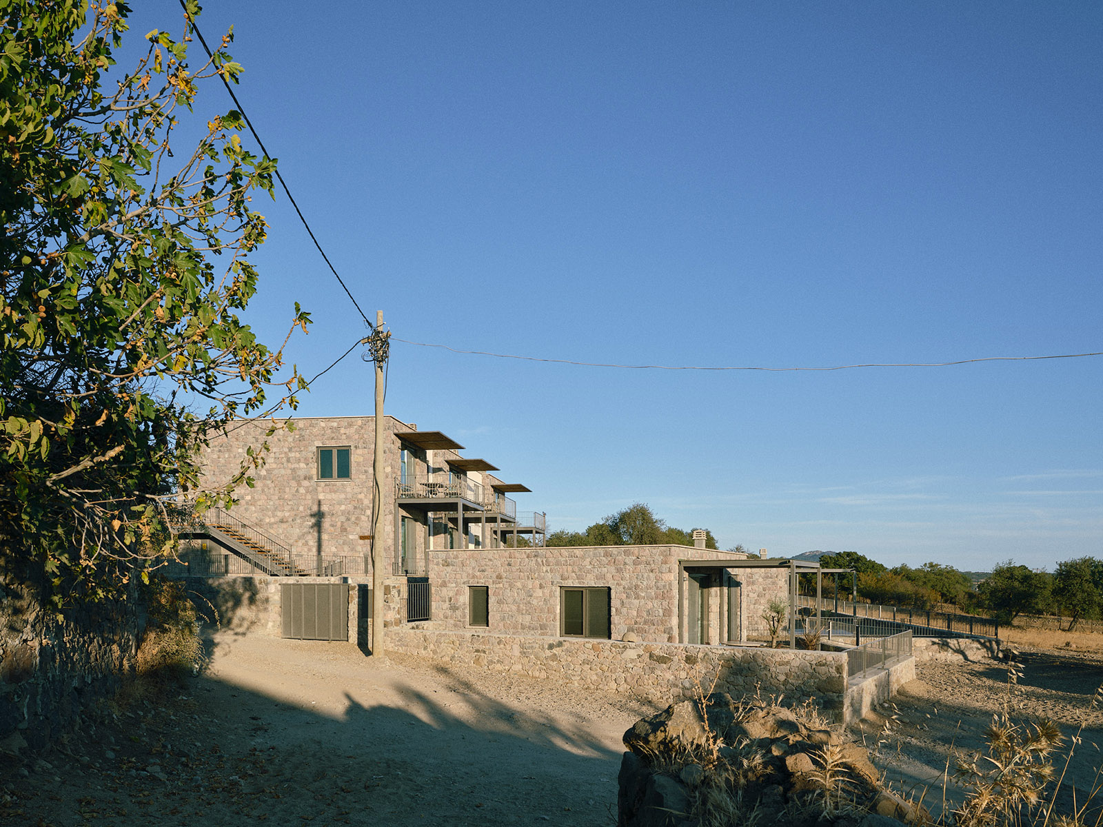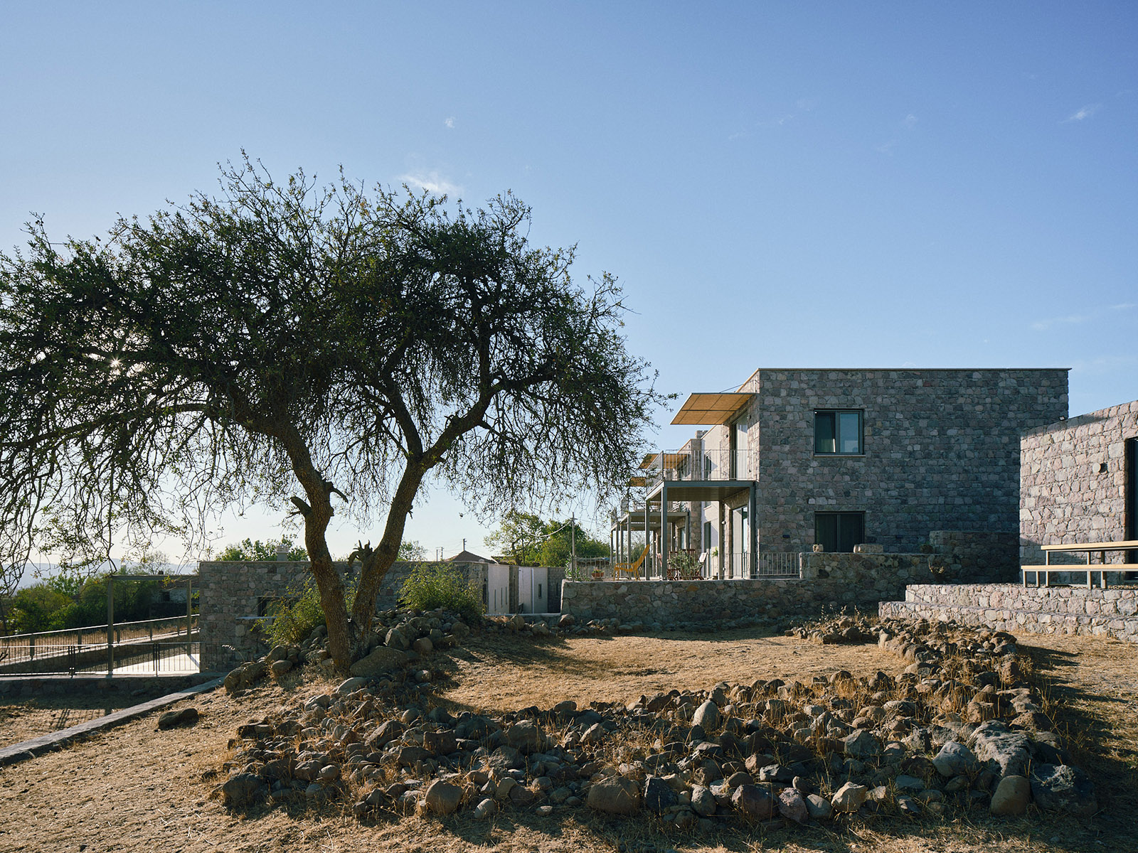 Adjacent to the houses, there is a land installation called “Prayer Space”, created by artist and architect Sinan Logie under an existing wild pear tree. Ormos Tartisik Guesthouse, designed to host various events throughout the year, faces the horizon through this installation.