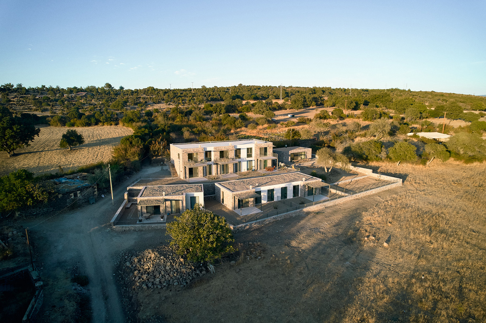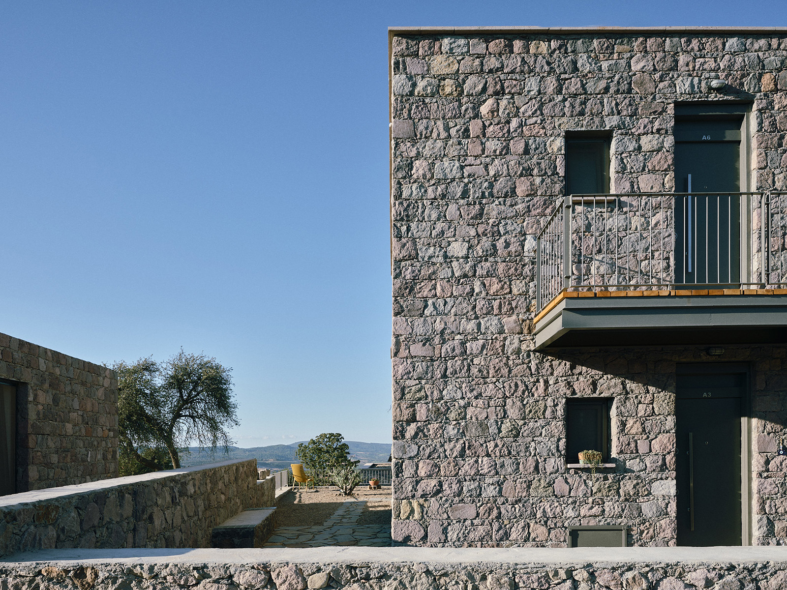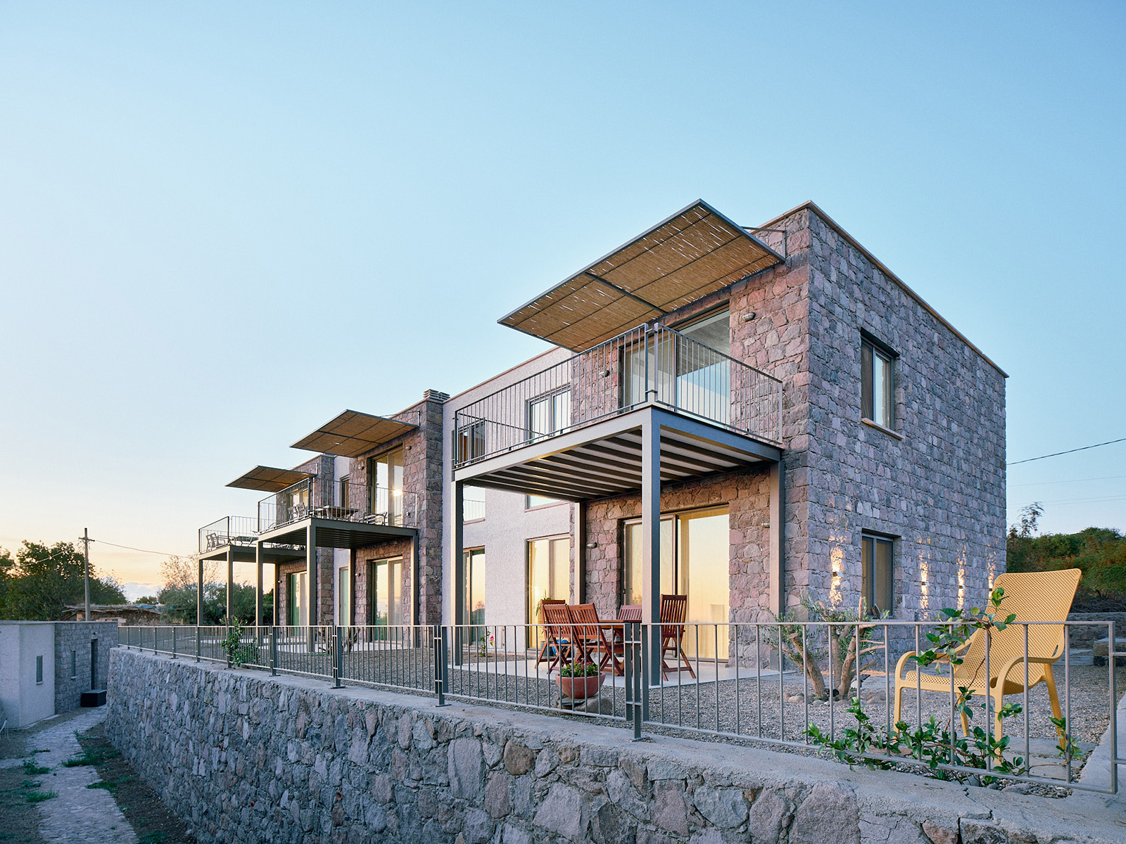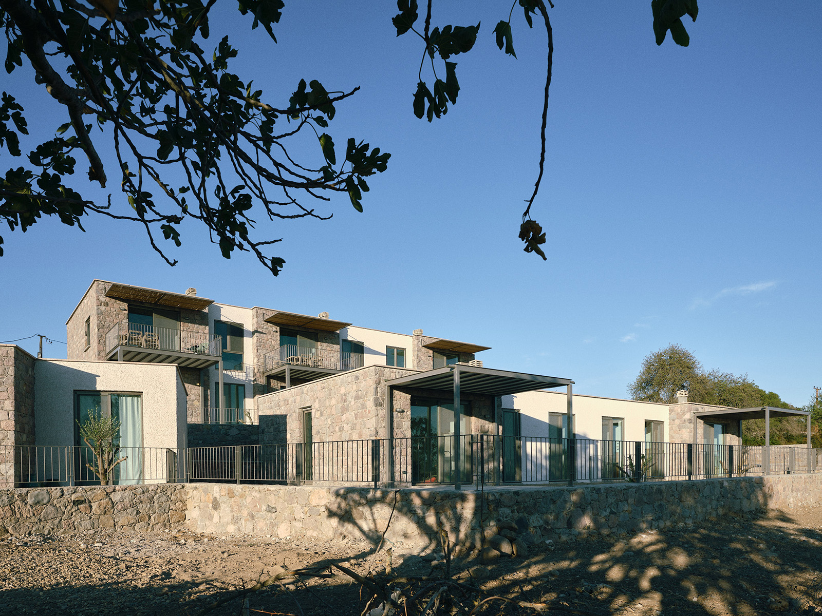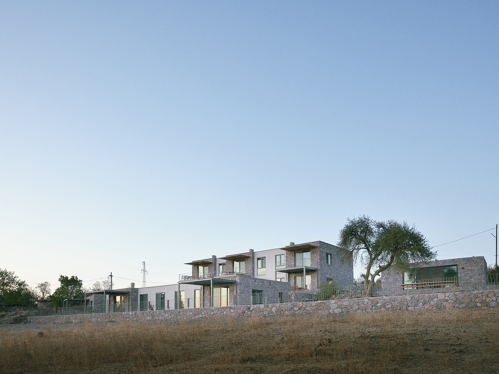 Adjacent to the houses, there is a land installation called “Prayer Space”, created by artist and architect Sinan Logie under an existing wild pear tree. Ormos Tartisik Guesthouse, designed to host various events throughout the year, faces the horizon through this installation.