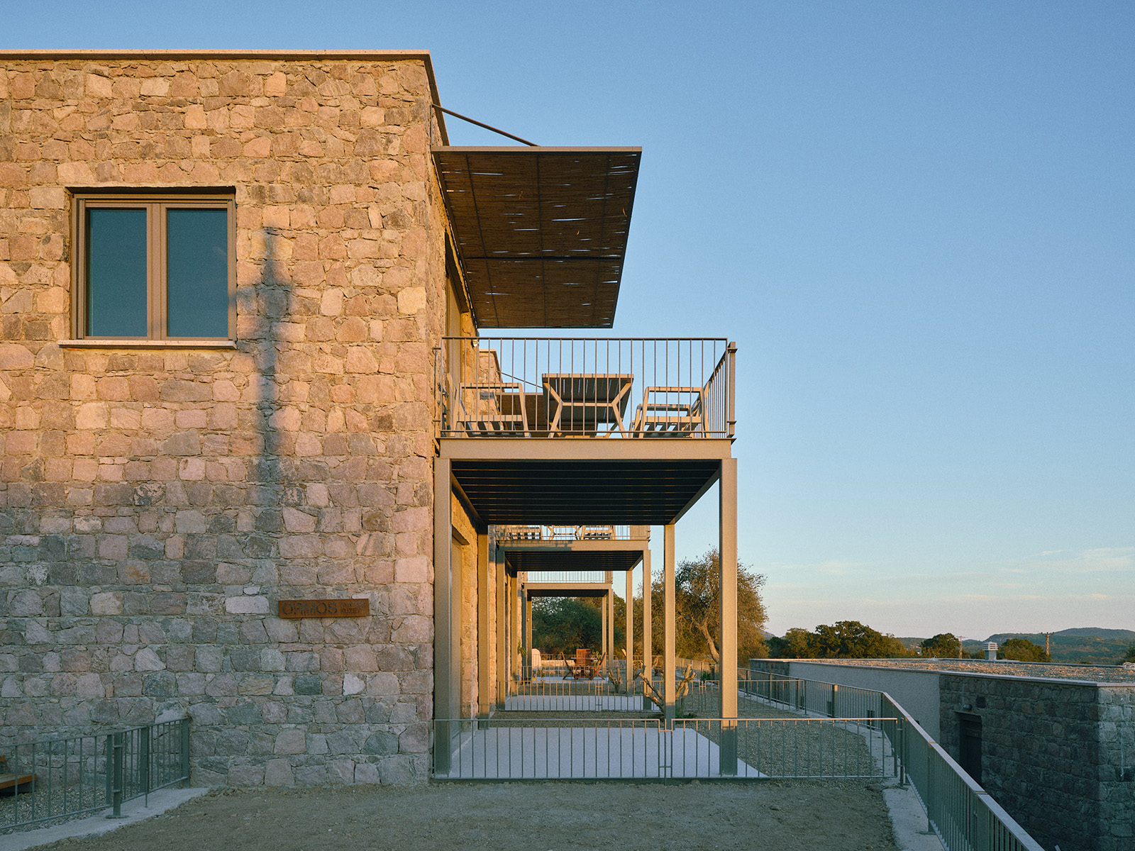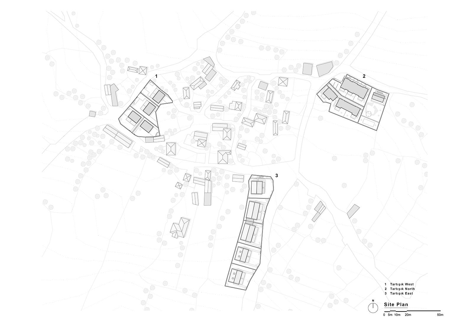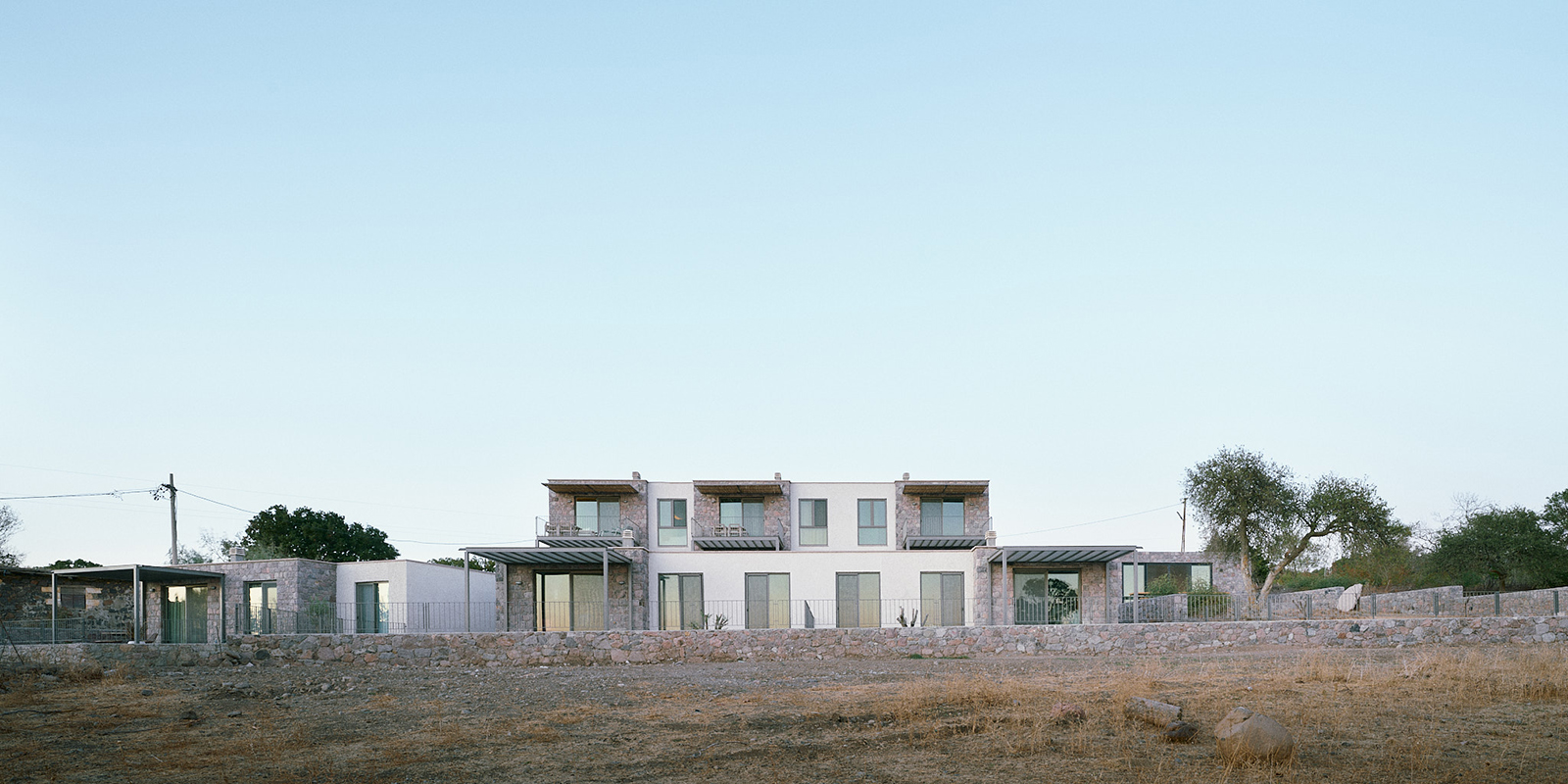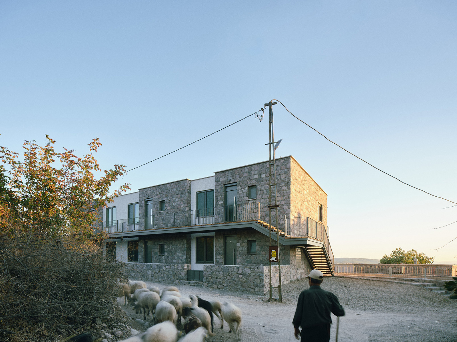 Adjacent to the houses, there is a land installation called “Prayer Space”, created by artist and architect Sinan Logie under an existing wild pear tree. Ormos Tartisik Guesthouse, designed to host various events throughout the year, faces the horizon through this installation.