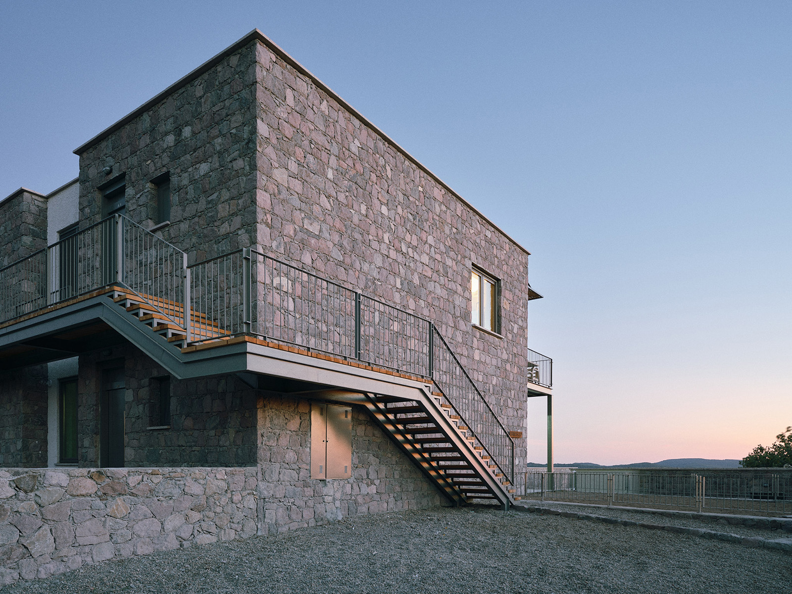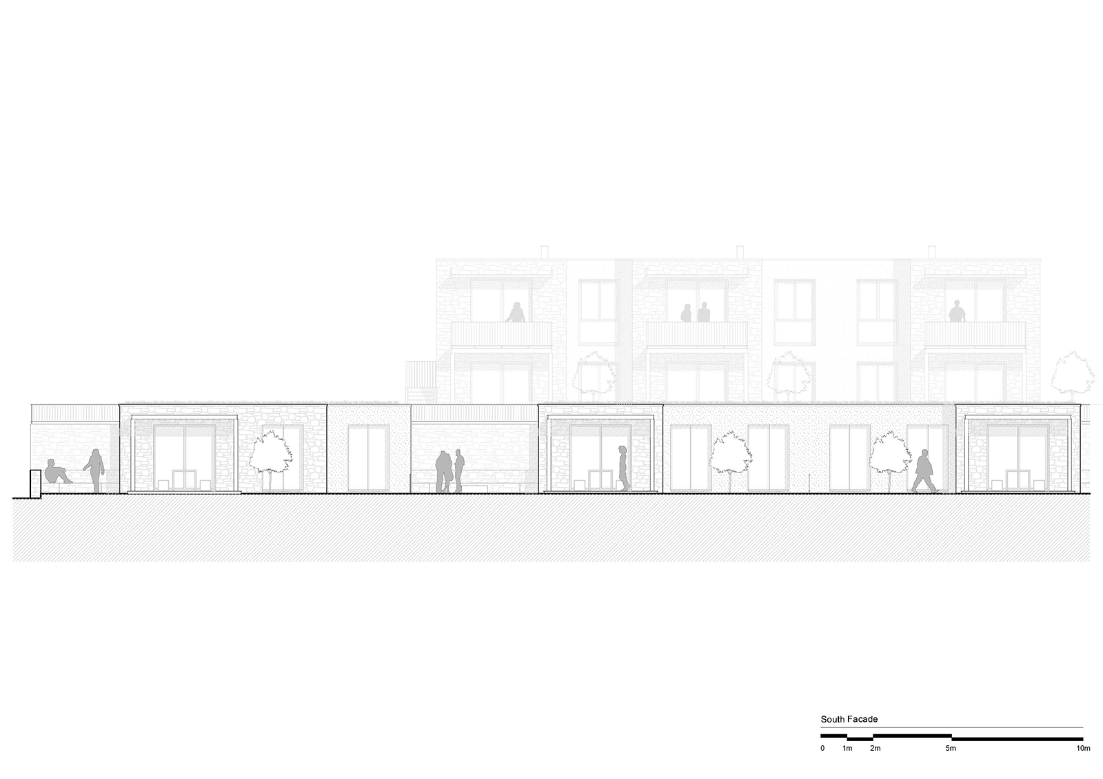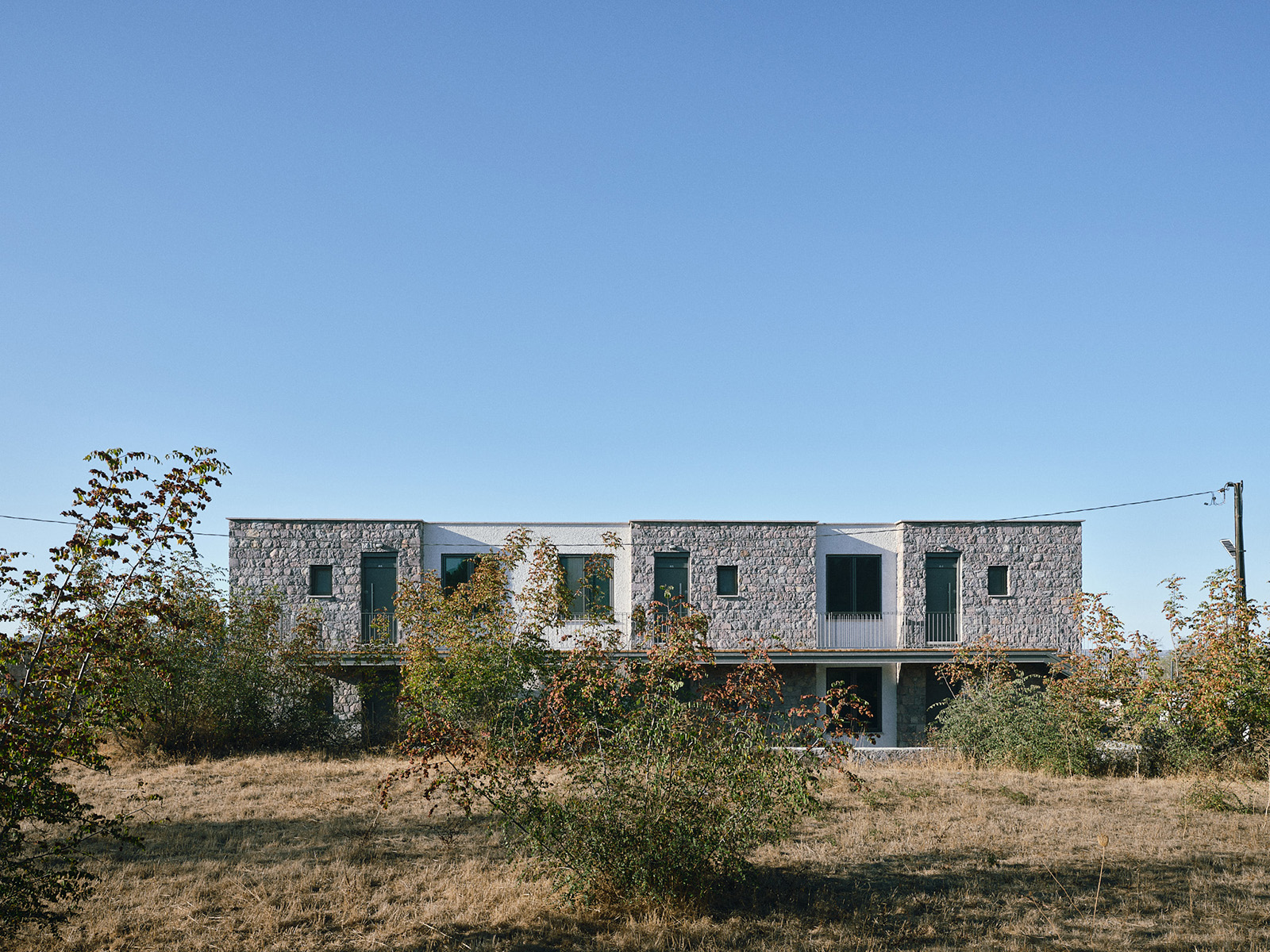 In both the rear apartment block and the front houses, façades clad in natural local stone are complemented by rough plaster-and-paint surfaces, adding textural richness to the exterior while harmonizing the buildings with the village’s original character. The articulation of the façades, aligned with the functional layouts, combined with the variation in materials, also contributes to the overall scale of the buildings.