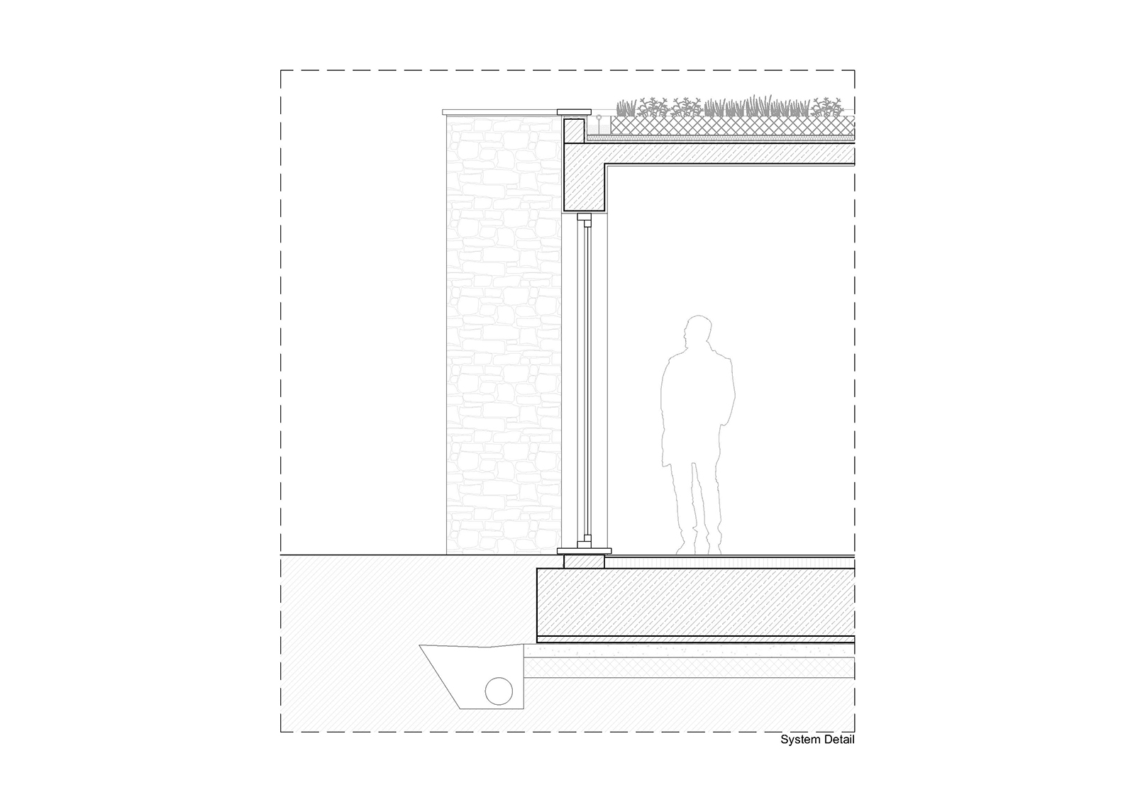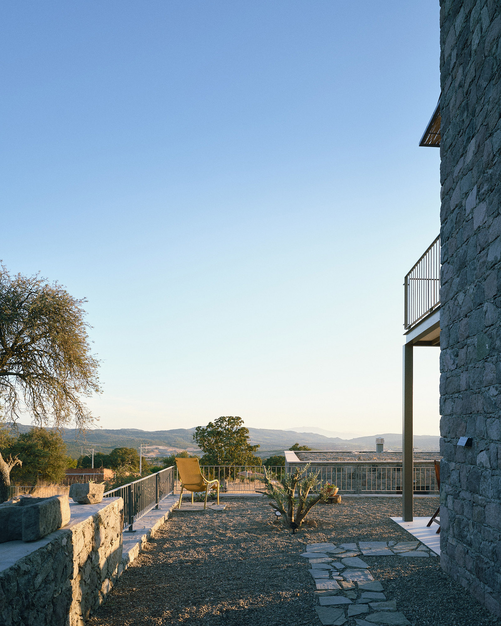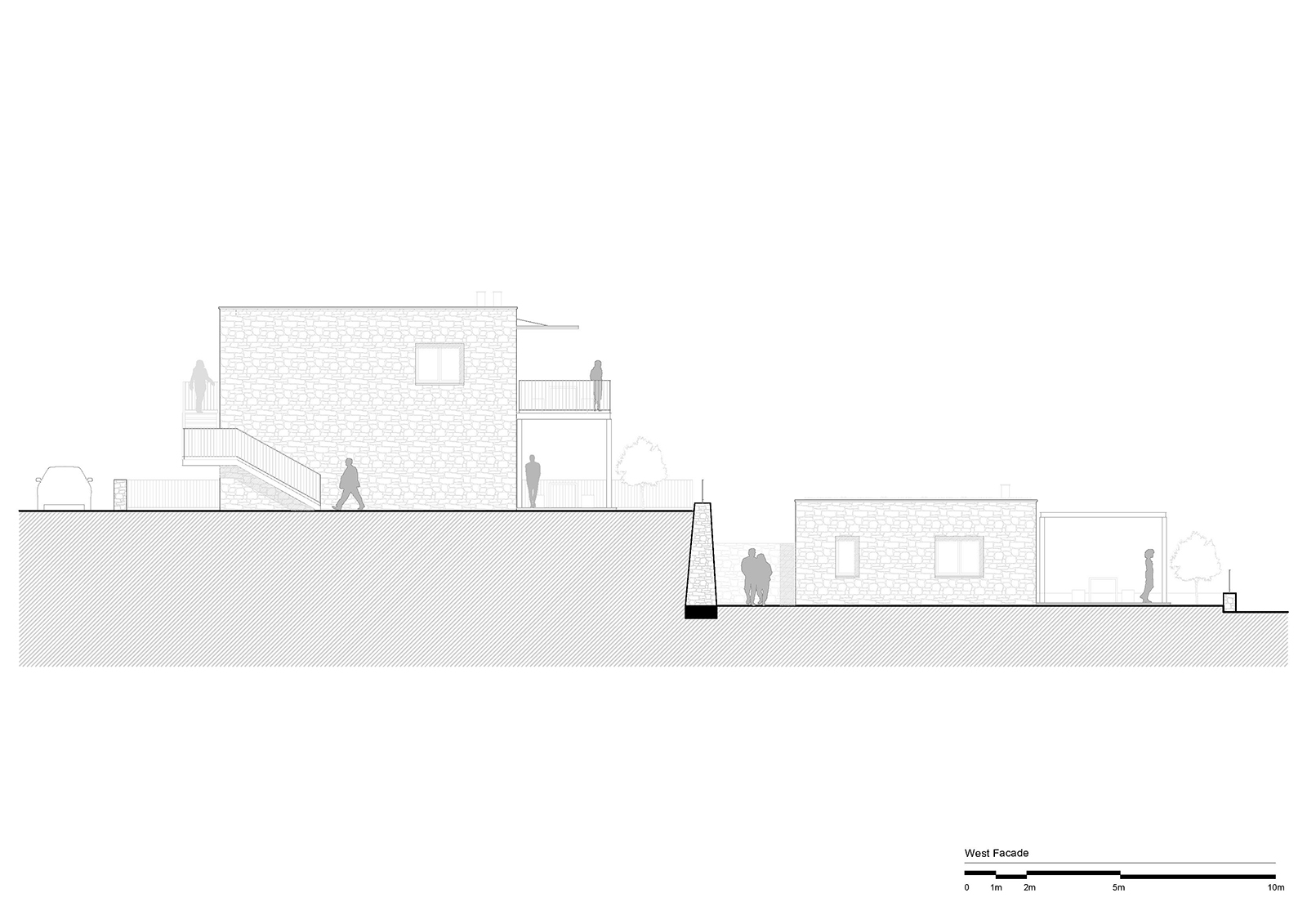 In both the rear apartment block and the front houses, façades clad in natural local stone are complemented by rough plaster-and-paint surfaces, adding textural richness to the exterior while harmonizing the buildings with the village’s original character. The articulation of the façades, aligned with the functional layouts, combined with the variation in materials, also contributes to the overall scale of the buildings.