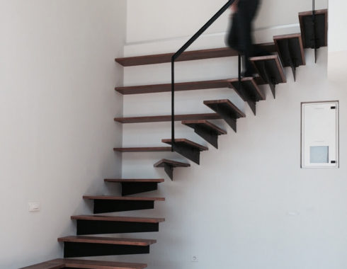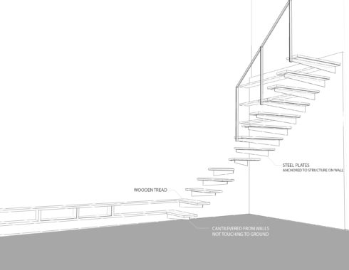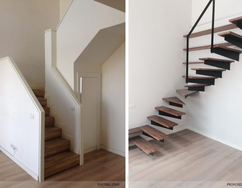 Here, our commission was to redesign the existing stairs, which are taking up a huge space in a relatively small loft apartment. However, instead of proposing a lighter and more compact alternative, we aimed at redefining the problem: How would we maximize the area of usage, while minimizing the footprint, in such a way to increase the spaciousness of the apartment as a whole? As a matter of fact, we designed a series of cantilevered steel plates, with no contact with the ground (minimum footprint), carrying wooden horizontal surfaces with different uses, such as shelves, TV unit, and of course, stairs (maximum area of usage). We think that in terms of spaciousness, the intervention is both physical and perceptive.