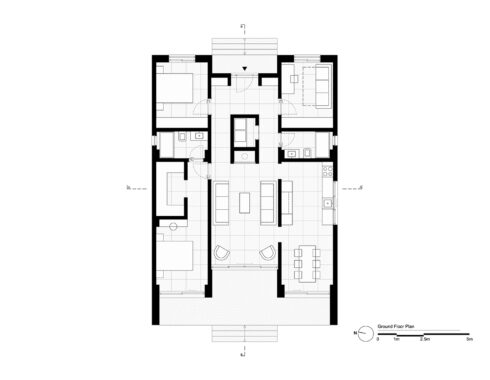 The house is placed and pulled towards the middle of the site, creating enough space for both an entrance with parking space and a backyard that is big enough for present and future functions. For circulation between the front and backyard and creating a privacy between neighbours, less openings on North and South sides are preferred and space for landscape is granted.